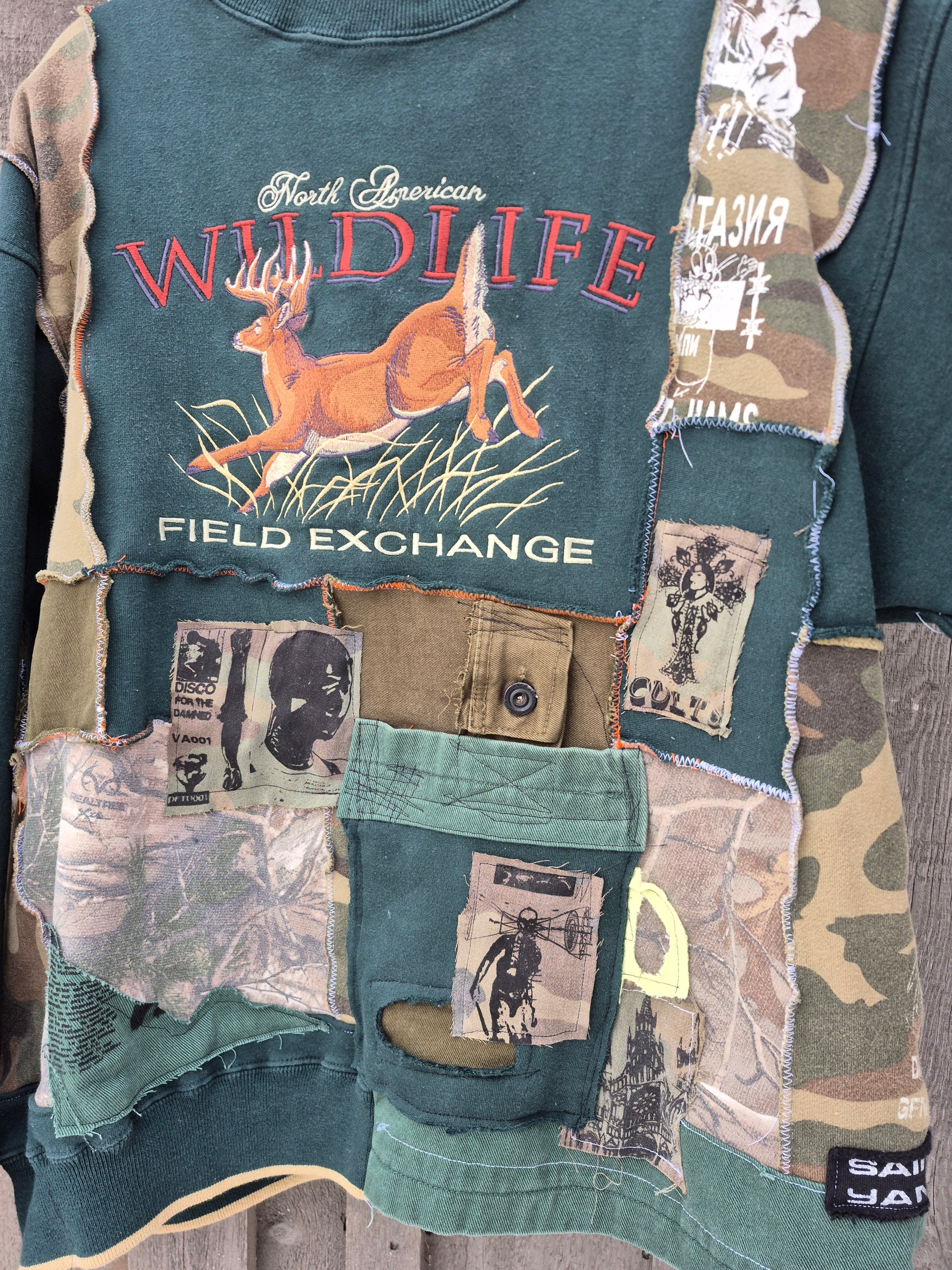 Β Β Patchwork crewneck sweater made with various shades of thick green swaths of fleece cotton & denim with a large embroidered graphic on the chest & camouflage patches with black prints throughout.