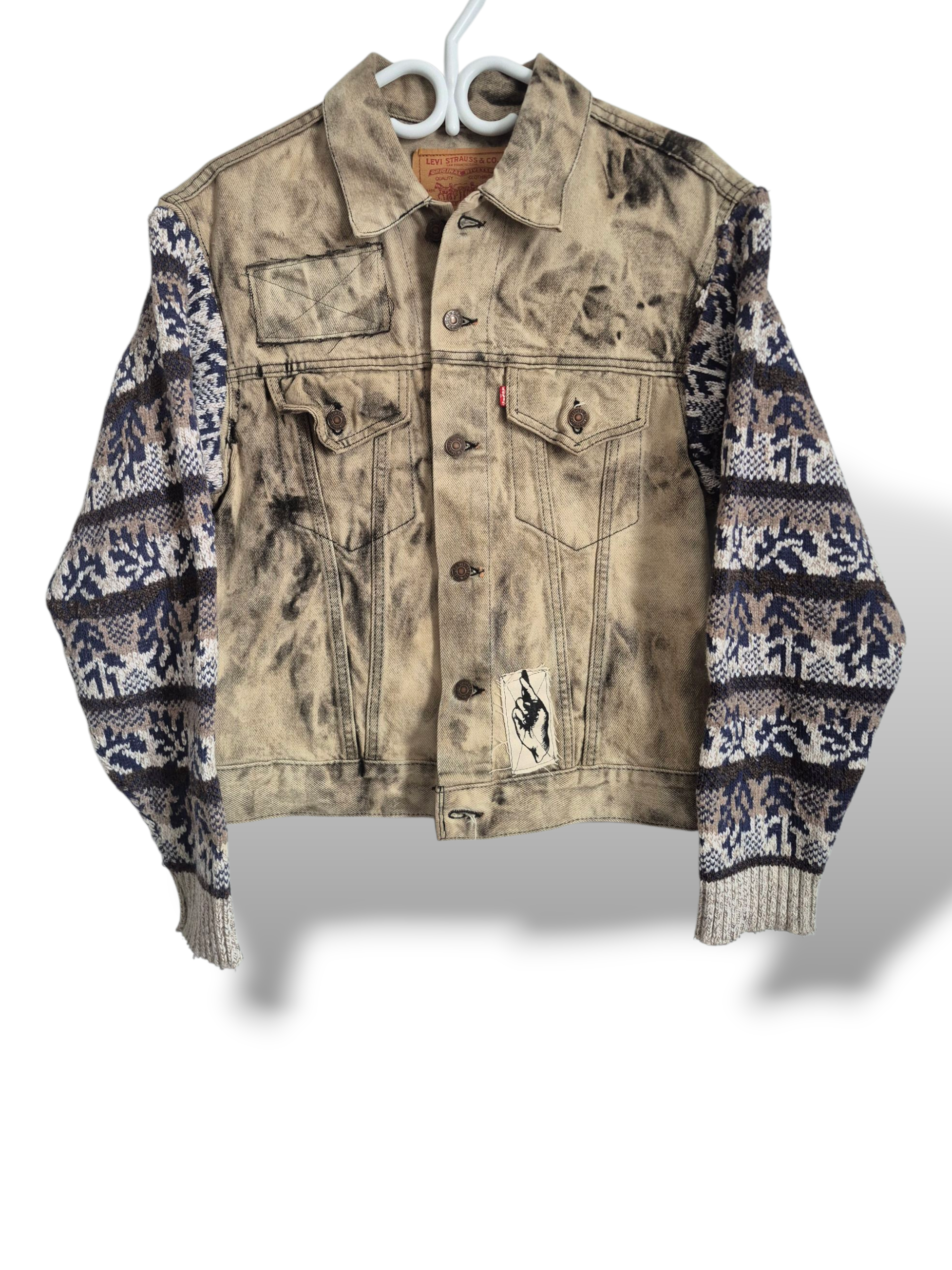 Reworked vintage Levi's denim trucker jacket with a deep acid wash giving it a dark cream color & matching beige & blue warm wool knit sleeves.