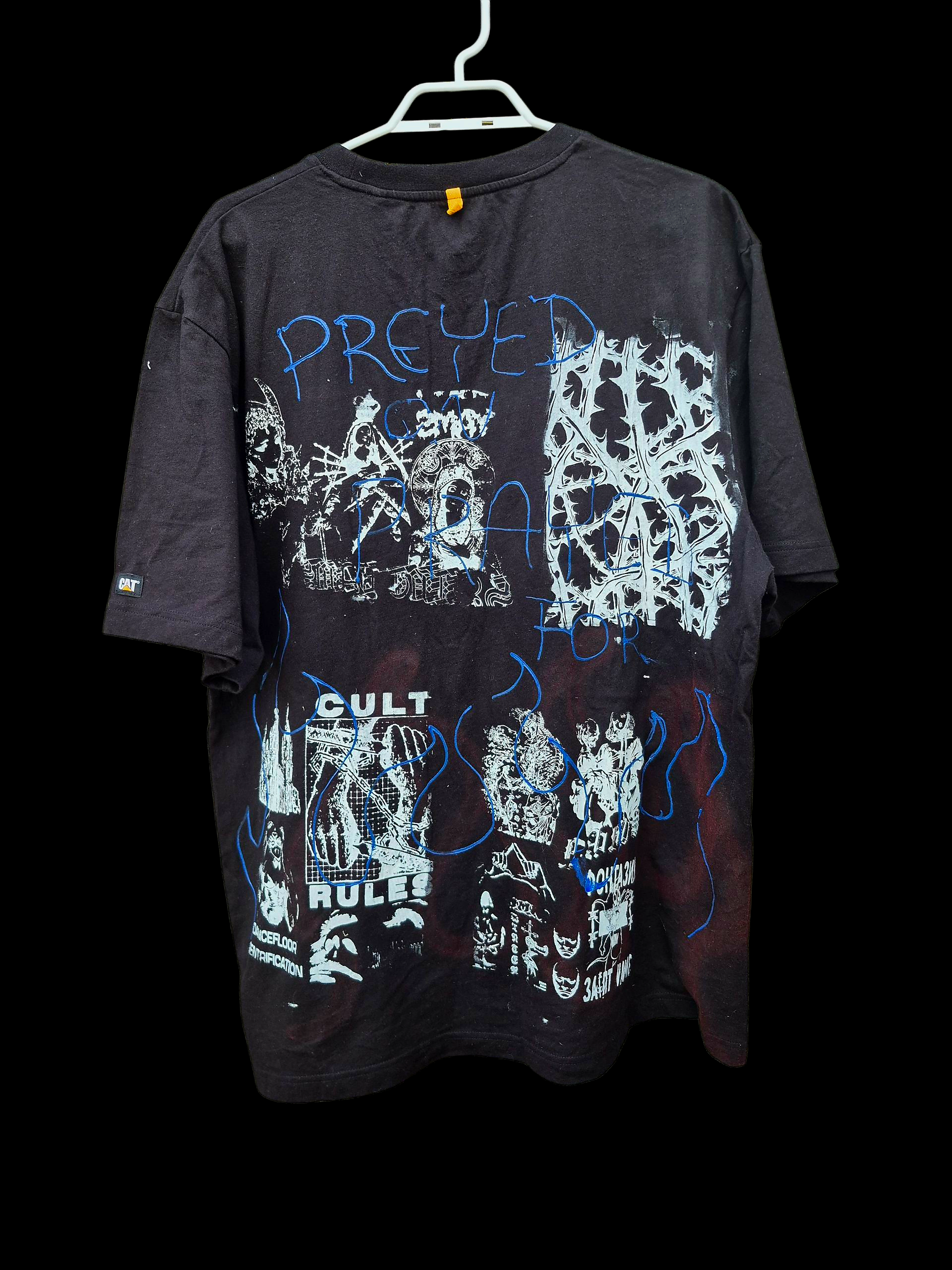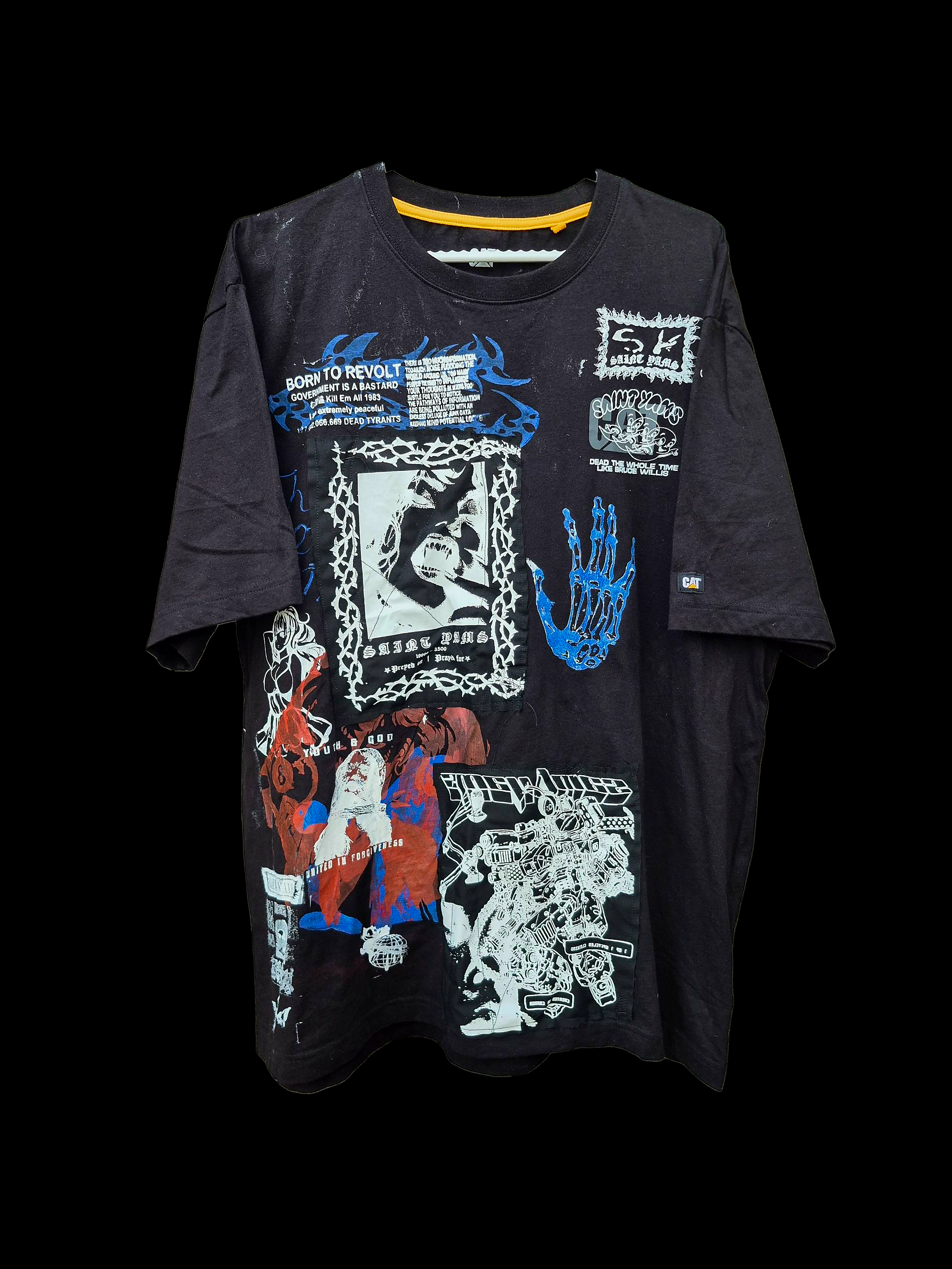 Heavyweight black cotton tee with a myriad of prints & patches scattered throughout.