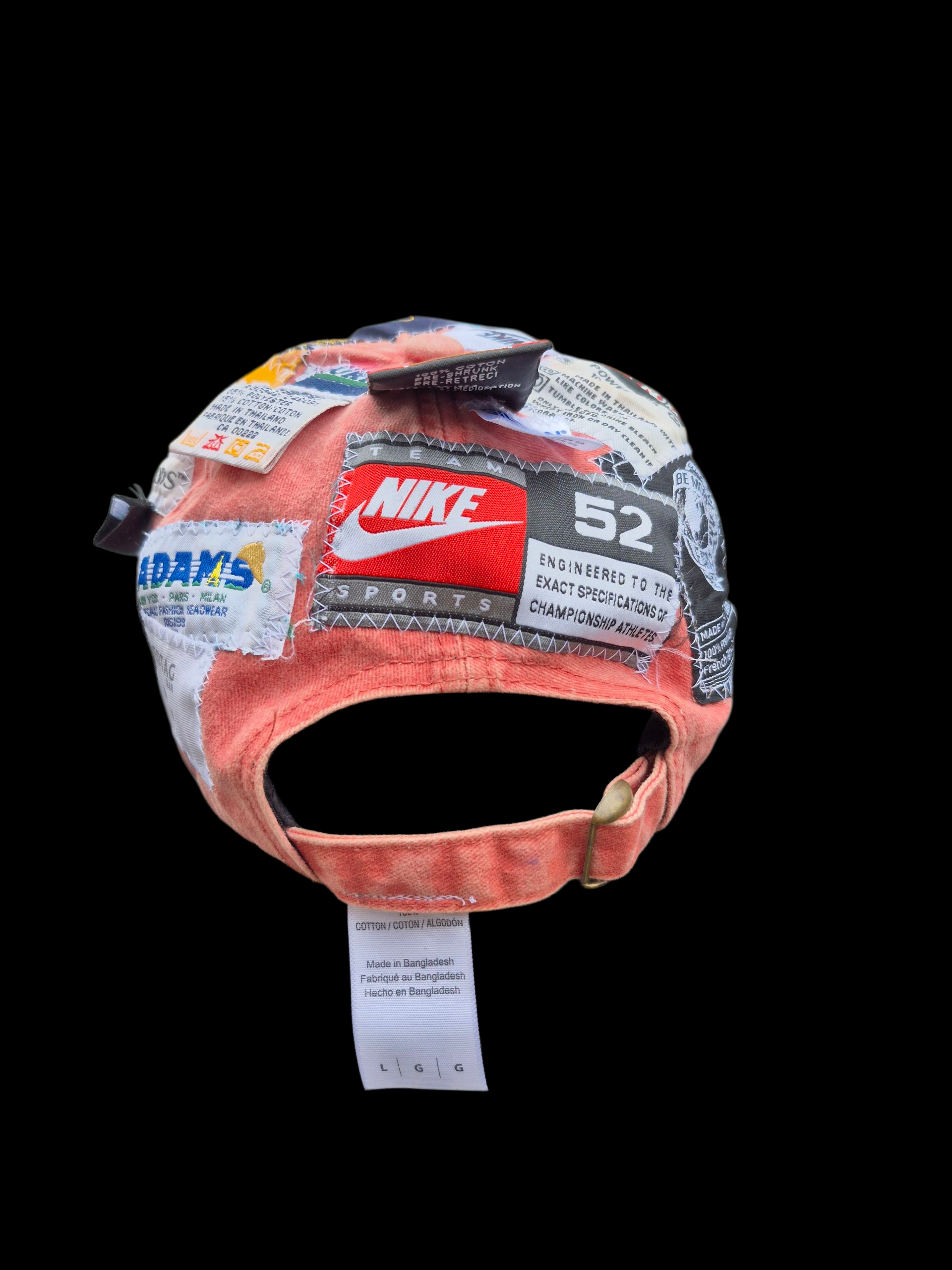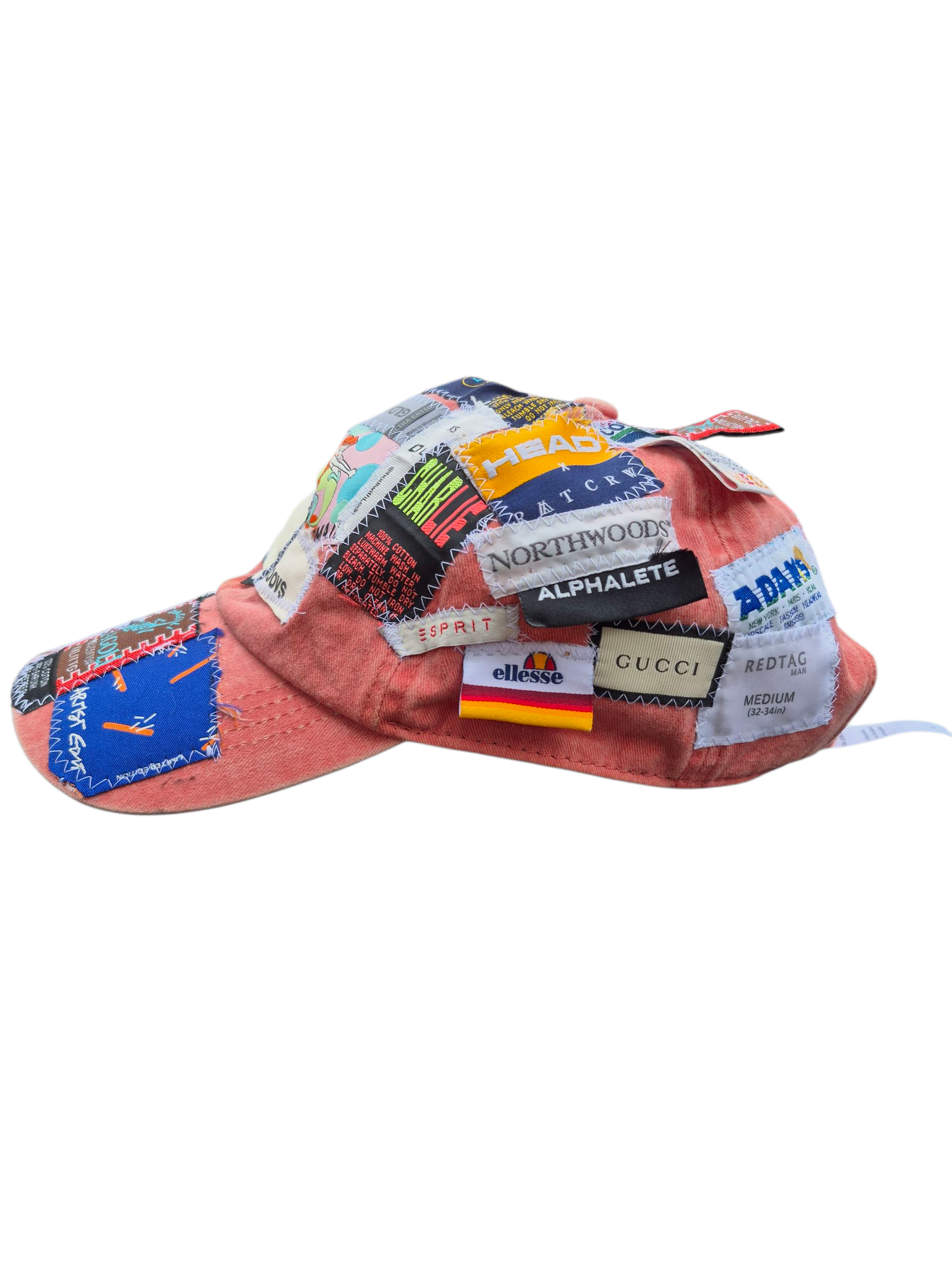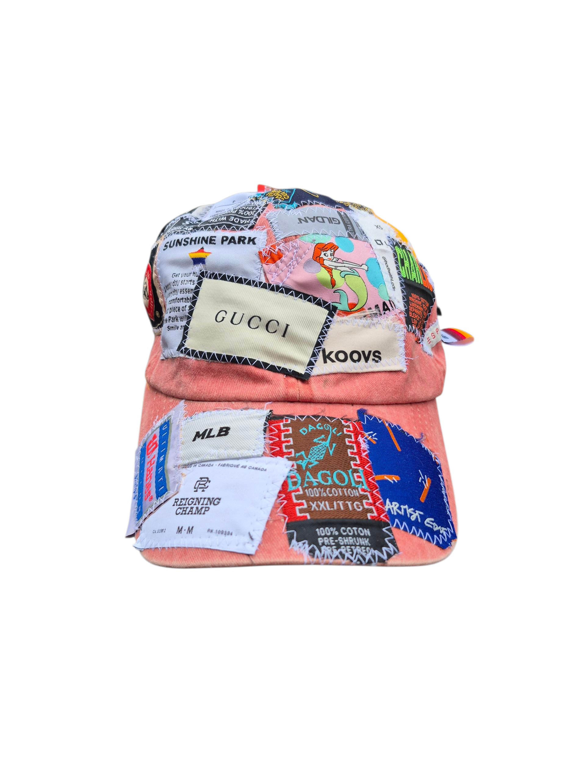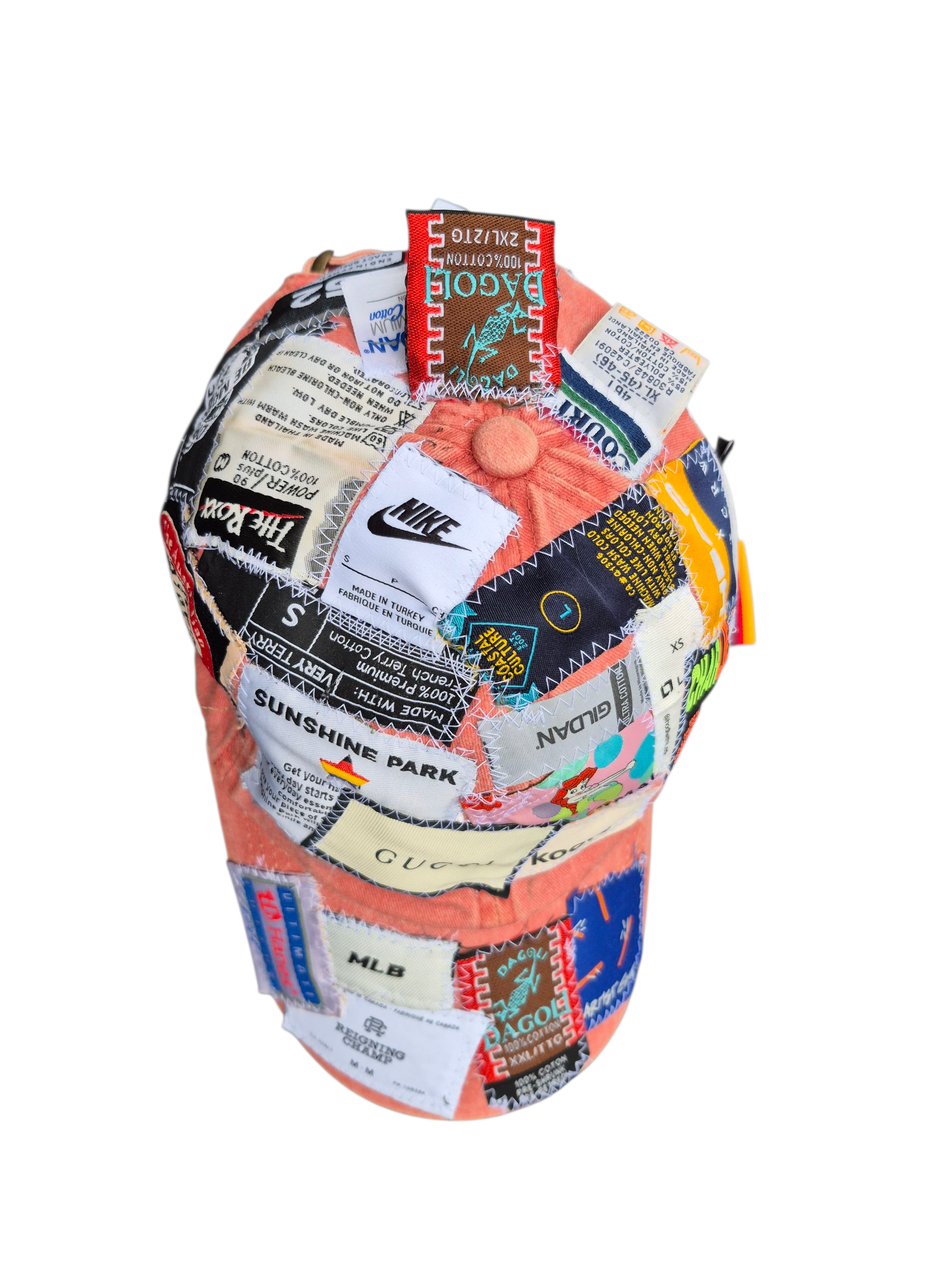 A peach colored strap-back dad cap with a heterogeneous collection of clothing tags sewn atop, including the brim.