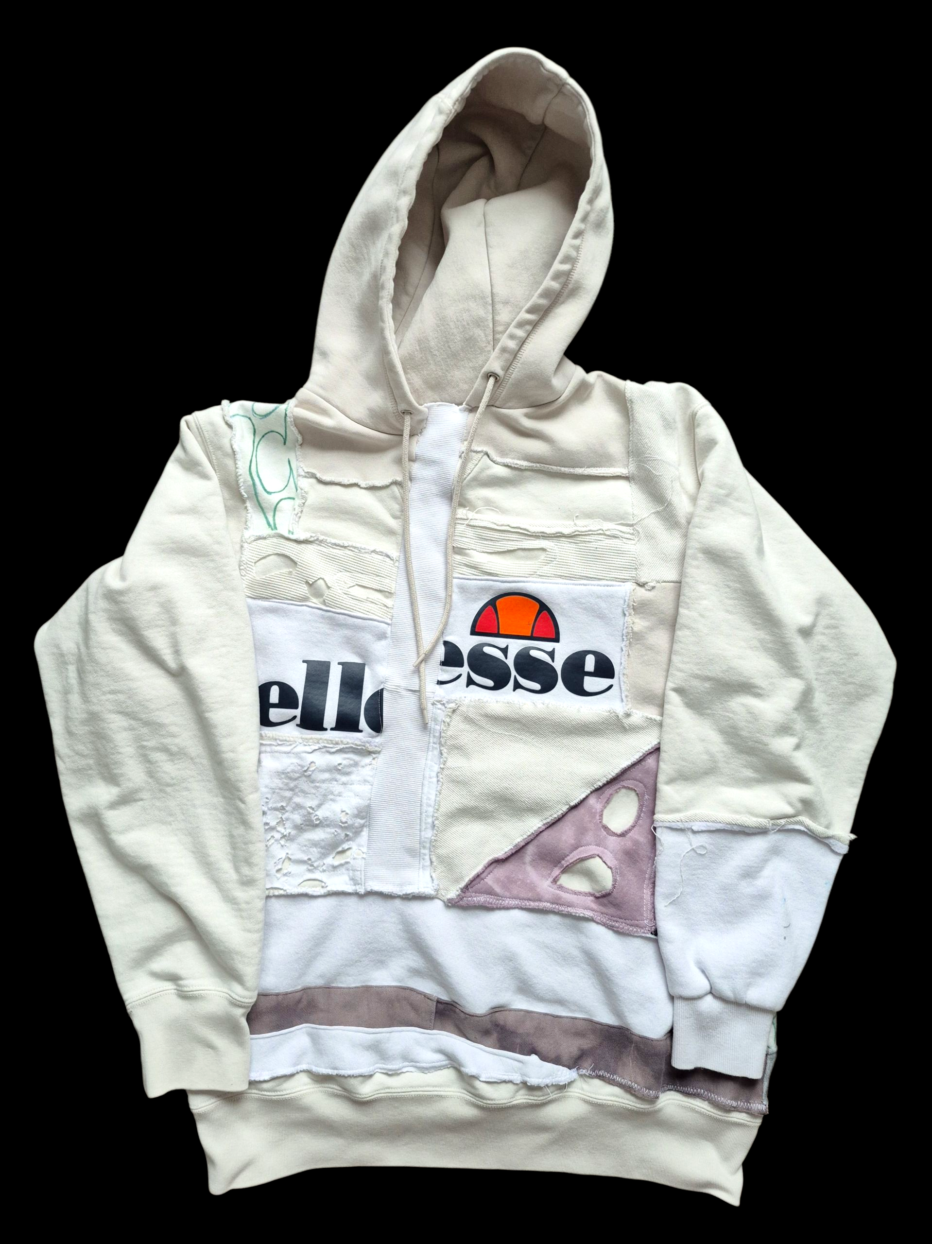 Β Β Cream colored cotton patchwork hoodie. Features an intricately paneled patchedwork design, tie-dyed purple accents throughout with a matching cyber sigil on the back, & made with top-quality soft fleece cotton fabrics.