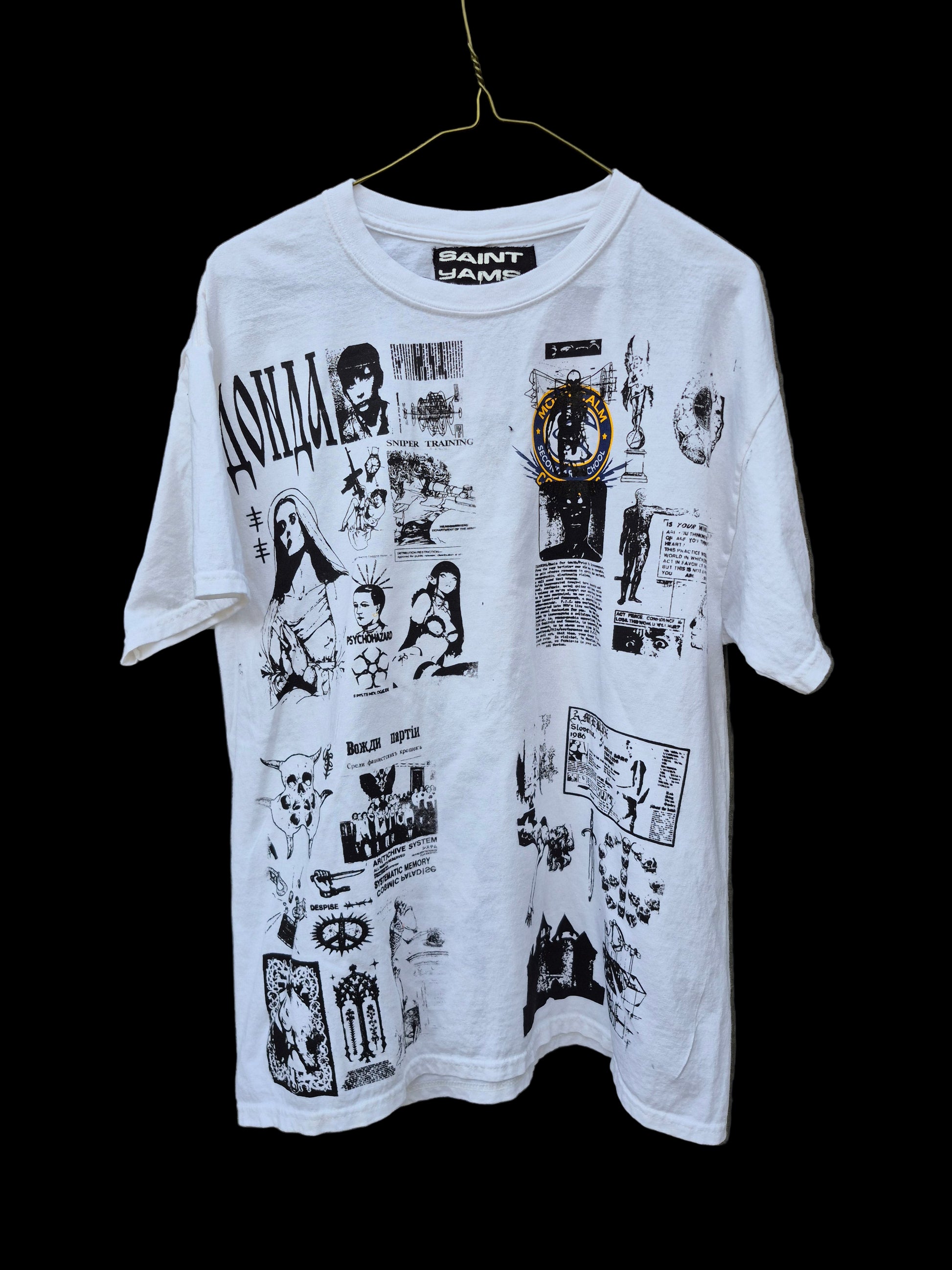 White cotton tee with custom prints, front & back.