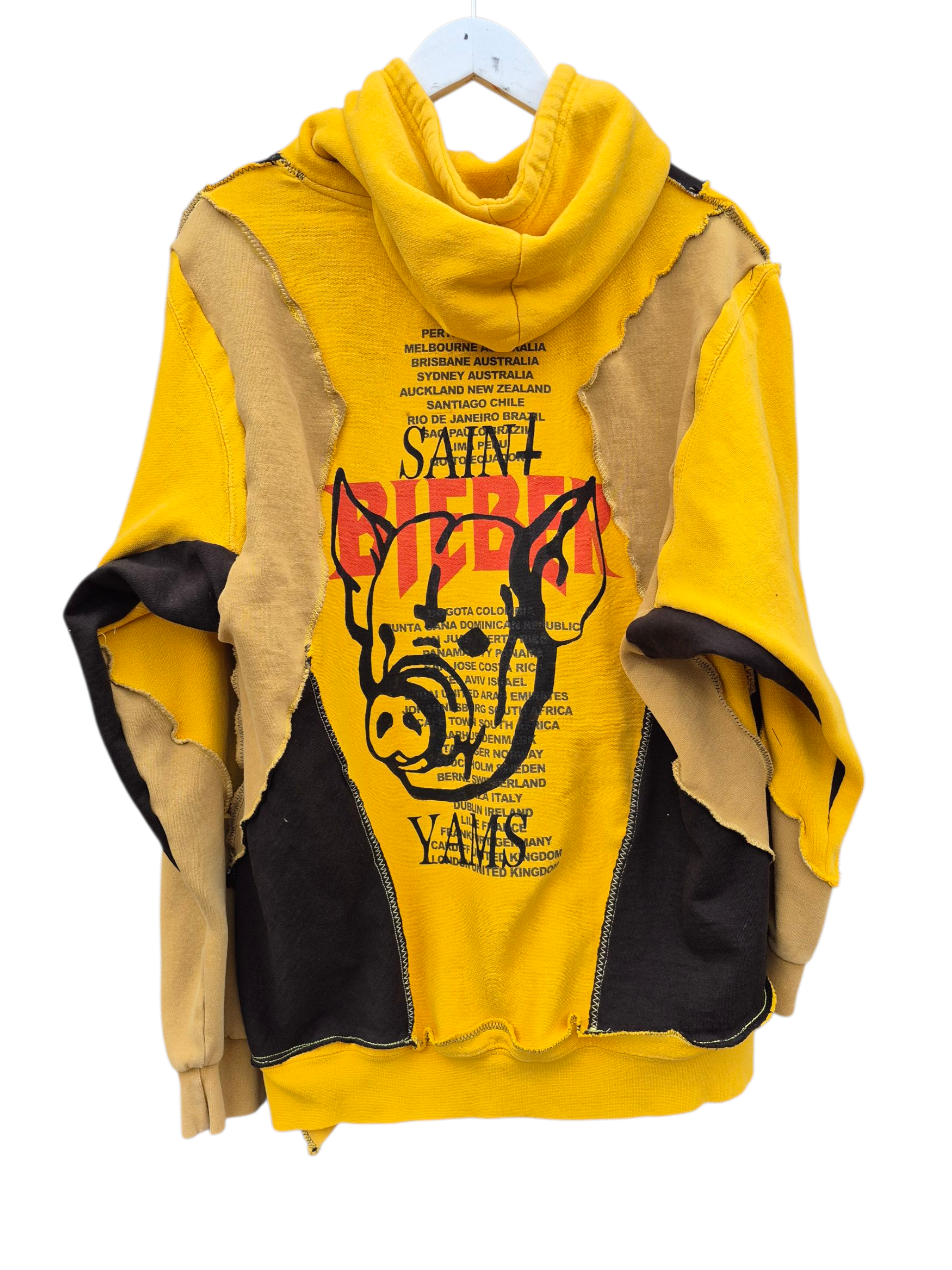 Β Β A mustard yellow, honey mustard yellow, and black patchwork hoodie made from thick fleece cotton and a reworked Justin Bieber tour hoodie. I was originally going to gift him this hoodie when I saw him on tour but then I remebered that doing so would involve buying tickets, and driving to the show, and sitting through an entire concert, then giving away this hoodie for free and it all just started to exhaust me so I did the next best thing: sent his biggest fan account on Insta a DM with a link to buy this hoodie (celebrities love it when you treat them like normal people). He's probably typing in the URL right now, salivating all over his keyboard like a goddamn bloodhound just thinking about buying this hoodie and supporting his soon-to-be favorite brand. I guarantee it. Then it's only a matter of time until we're best buds. Me and him. Him and I. I can see it now, bonding and laughing at eachother, playing with eachother's hair, at first it's awkward but feels natural in no time, like we've known eachother since we were kids. There's a little flirting perhaps but nothing ever comes of it, mainly cause his 3rd wheel of a wife is always around UGH. Eventually we grow old together, naturally die at the exact same time while we're both mid sentence holding hands & then buired together in the same casket, together forever. I haven't how we should be positioned in the casket, whether it'll be a face-face or both facing the same way (Tobogan style) or possibly event Face-to-Butt (Seinfeld style). I figured we'll have plenty of time to figure out the details. There is one thing I'm excited to ask him though, which is: "Do you and your wife ever swap wigs and go about your days as eachother? And if so, can I get in on it? I'll be the Biebs, Biebs goes as Baldwin, and Baldie goes as moi. We can call it a 'freakyΒ tri-day.' Get it? Like Freaky Friday. But its 3. Do you get the joke? Baldie!?!?!"