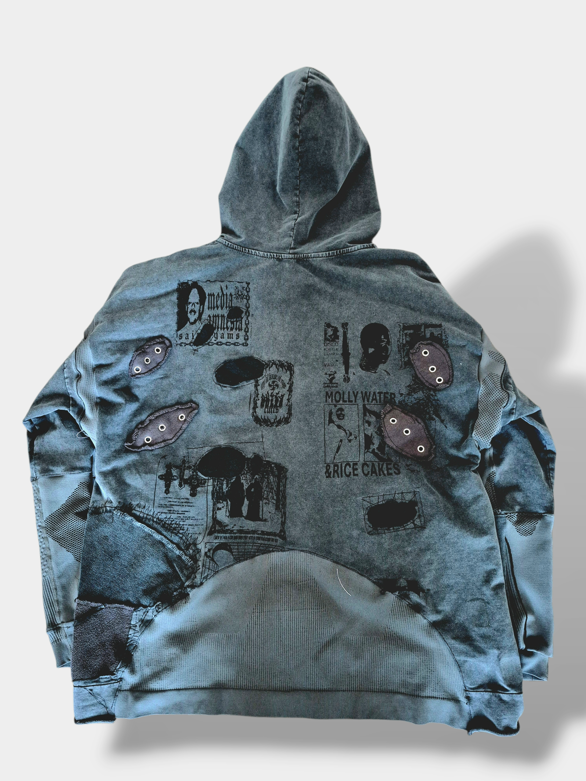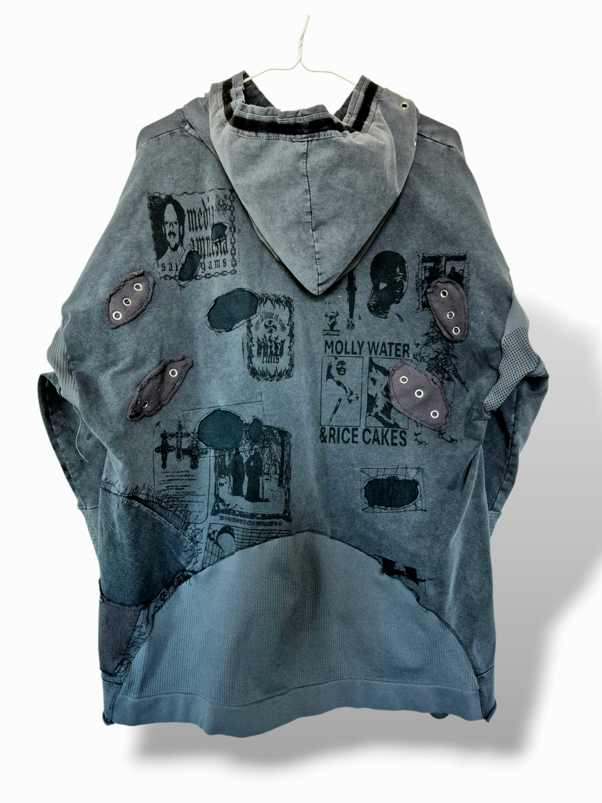 Β Β Β Lightweight grey acid washed hoodie with articulated cut, 3D cargo pockets with snap button closure, futuristic paneling & grommets placed throughout for breathability.Β