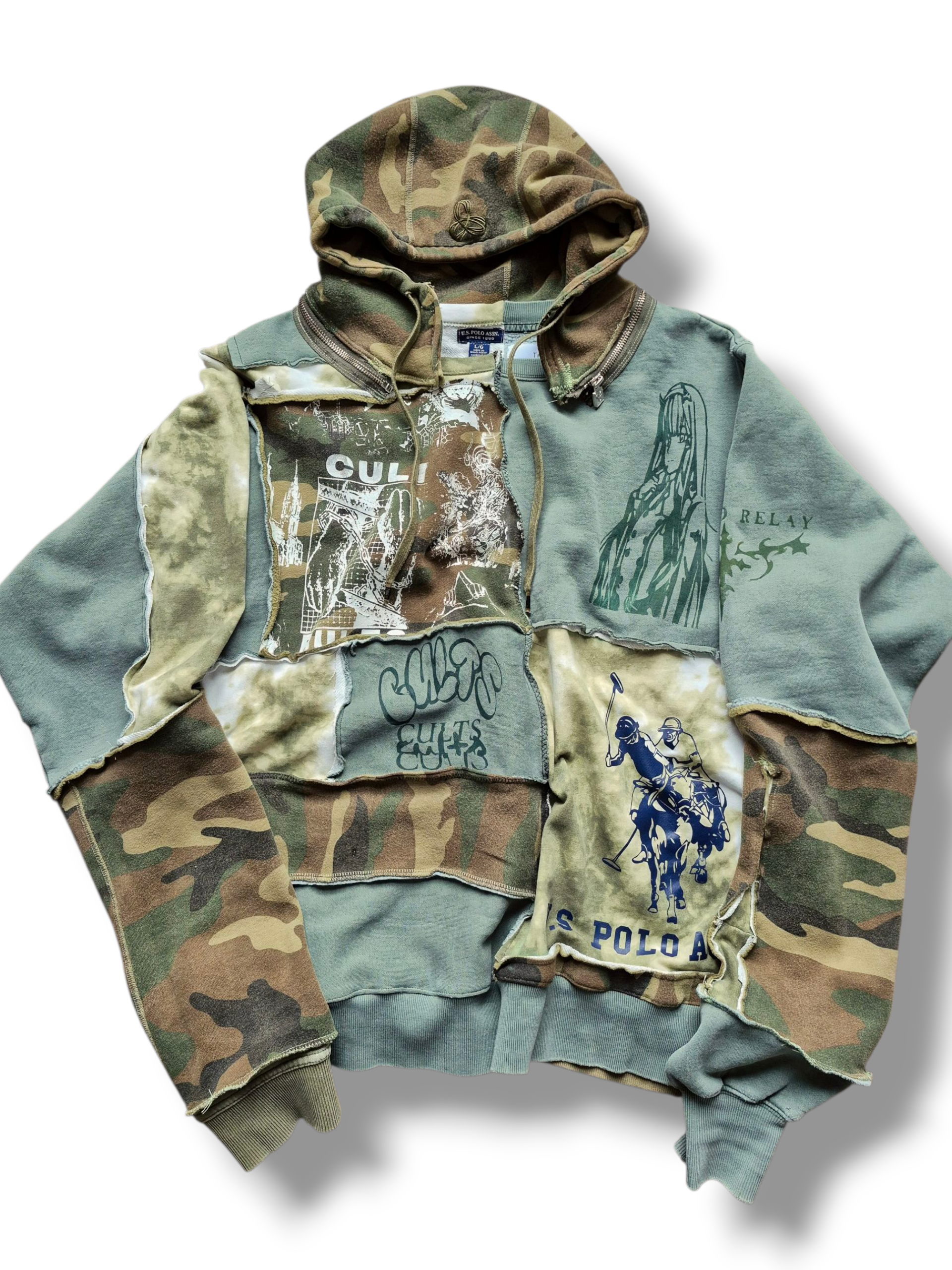 Green patchwork hoodie made using fleece cotton sourced from two TNA hoodies, one in olive green & the other in camouflage, & a Polo Ralph Lauren crewneck sweater with a swirling green & white tie-dyed print. Meticulously cut & sewn with elongated sleeves & a hood that is detachable via a gold colored TNA zipper encircling the deconstructed neckline, this is one you won't easily forget.