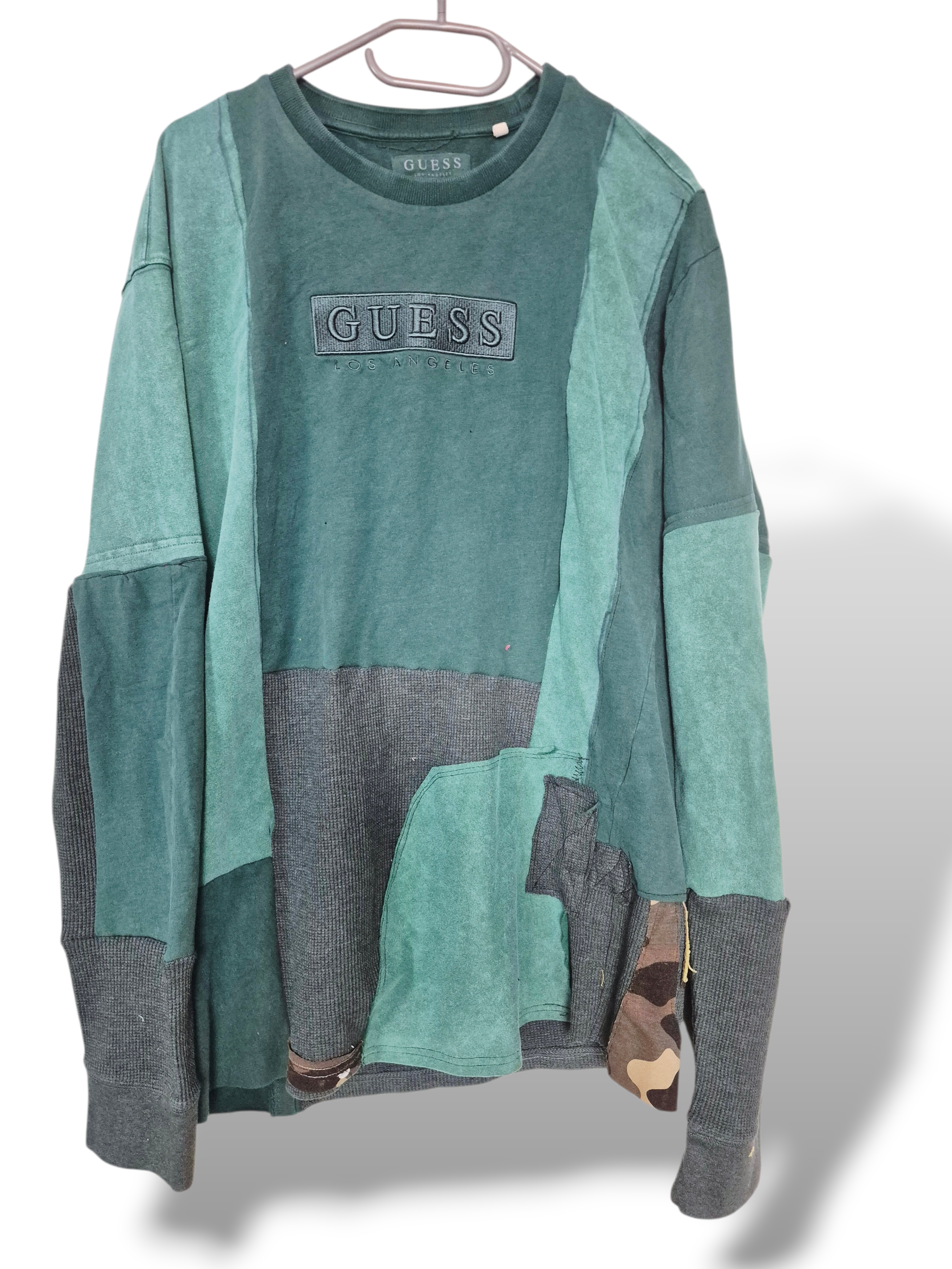 Β Β Patchwork long sleeve shirt utilizing various shades of greenish turquoise and cotton fabrics (ring spun & thermal knit).