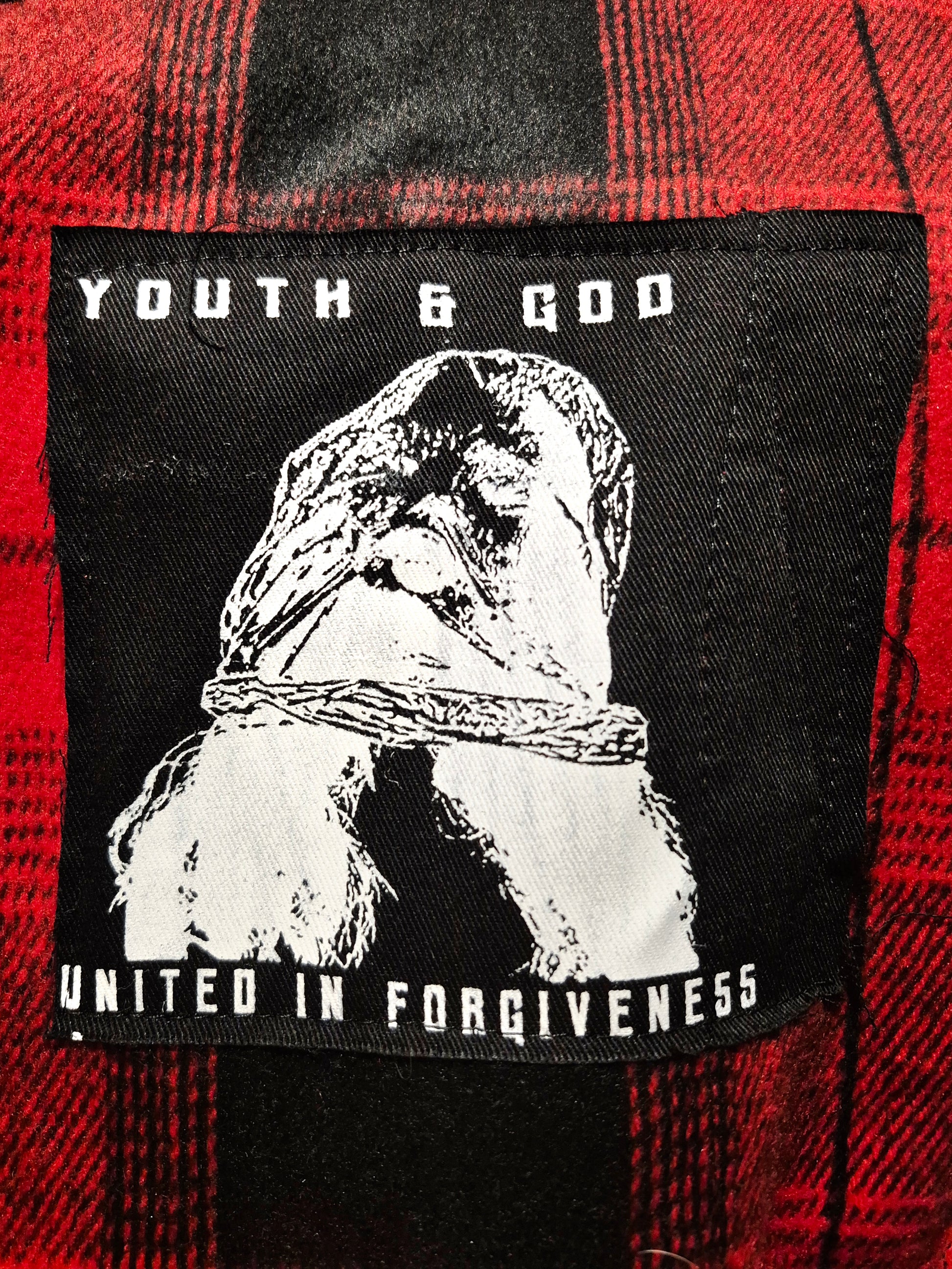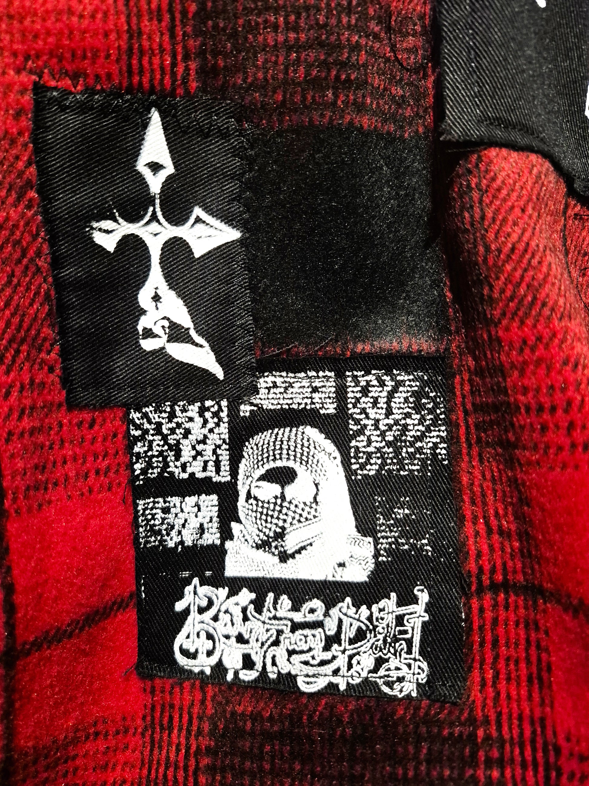 Β Β Β A red & black heavy plaid flannel with black denim patches with white prints scattered throughout its surface. Can be worn casually as a shirt or as a substitute for a cold weather jacket.