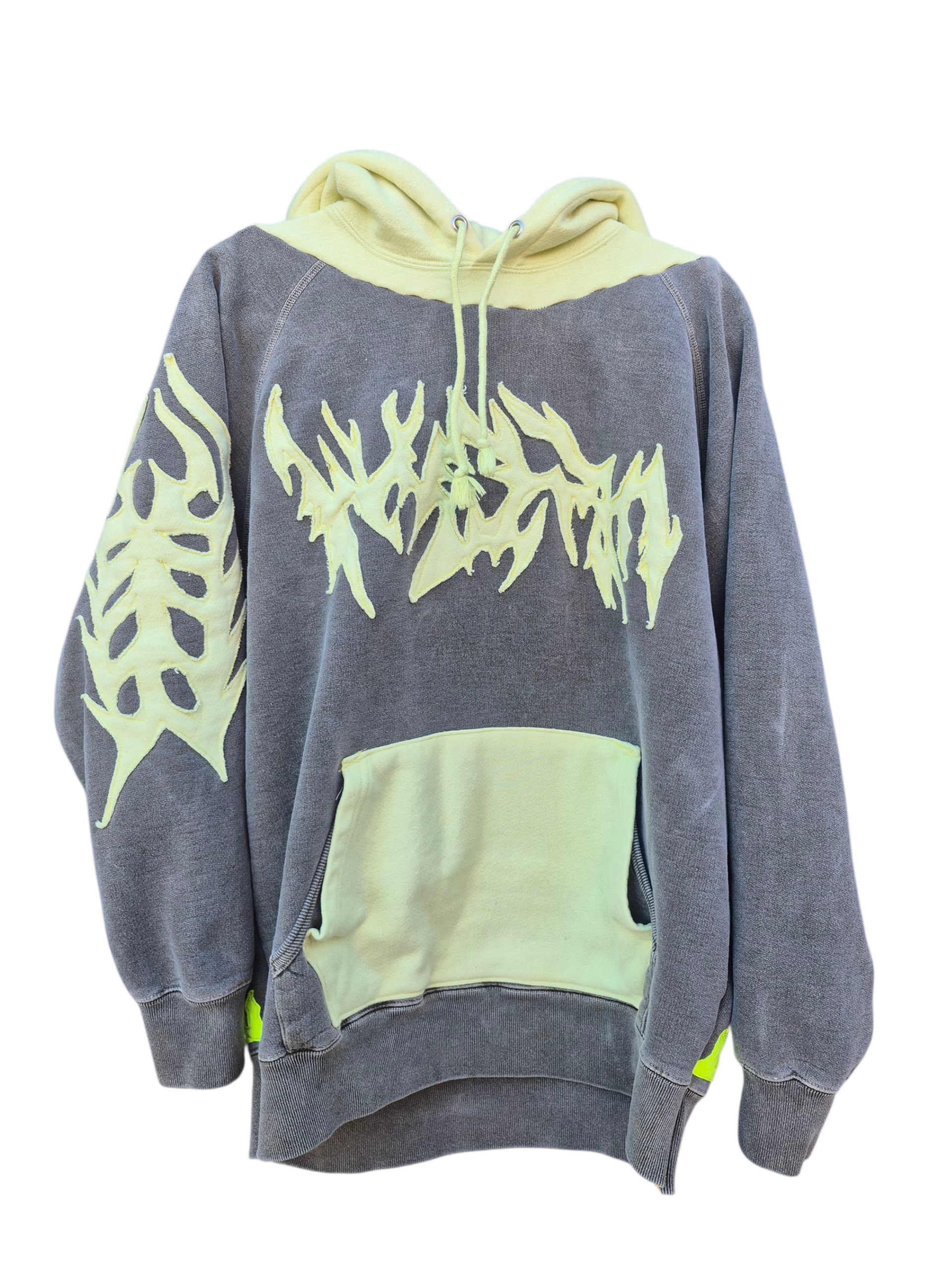 Light grey hoodie with bright green hood, pouch and graphics on the chest, arm & back each made with layered thick fleece cotton.