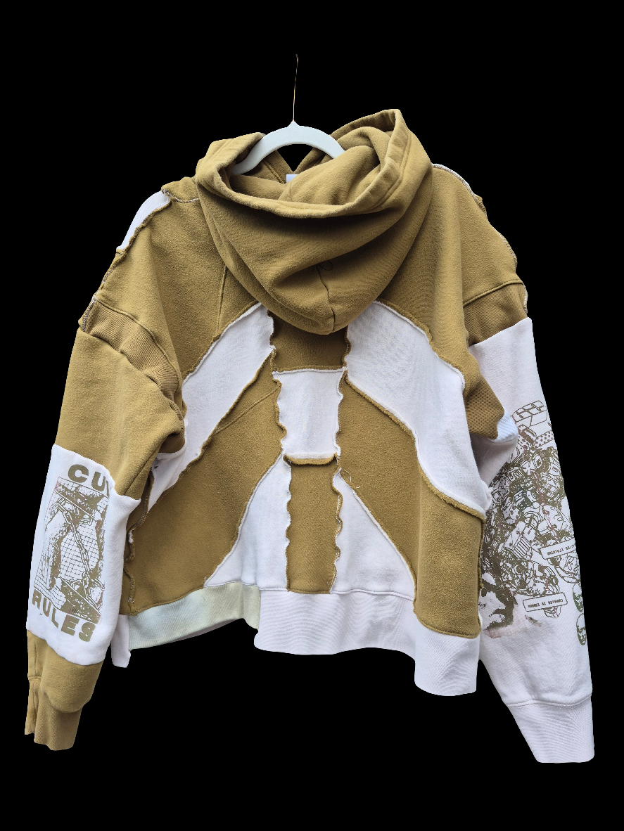 A muddy green & cream color block patchwork hoodie with a wide boxy fit, a deep & spacious hood & dual zippered pockets replacing the traditional pouch pocket.