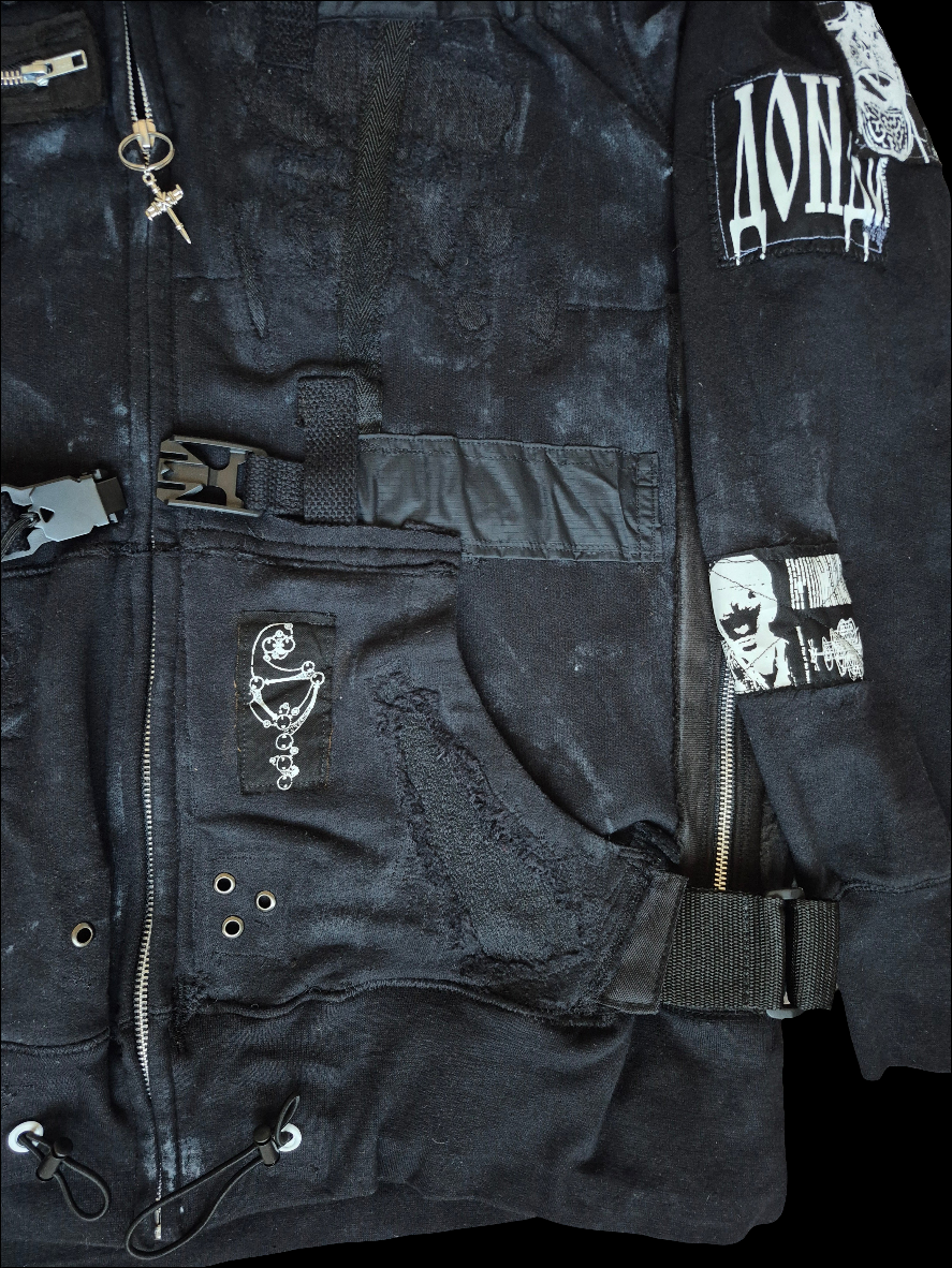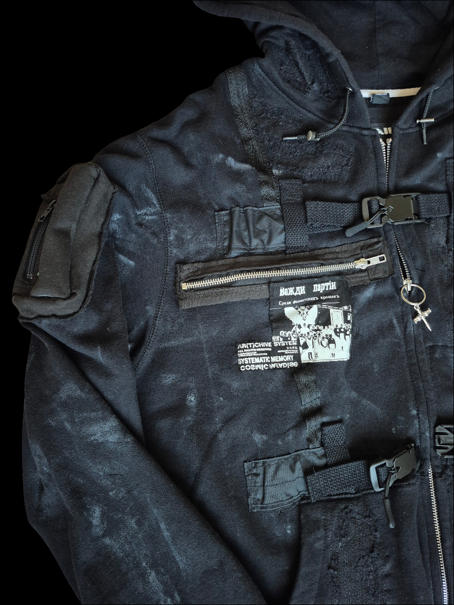Β Β Β Pitch black, acid washed, fleece cotton hoodie with an array of features including dual magnetic buckles with cotton straps & elastic support, reinforced distressing throughout the front & back with heavily threaded visible-mending overlay, elastic drawstring + cordstoppers around the waist & hood, metal hardware throughout, zippered pockets including a 3D cargo pocket on right sleeve & an extra large pocket on the left side big enough for laptop/tablet carry & a barrage of overlapping black twill printed patches.Β