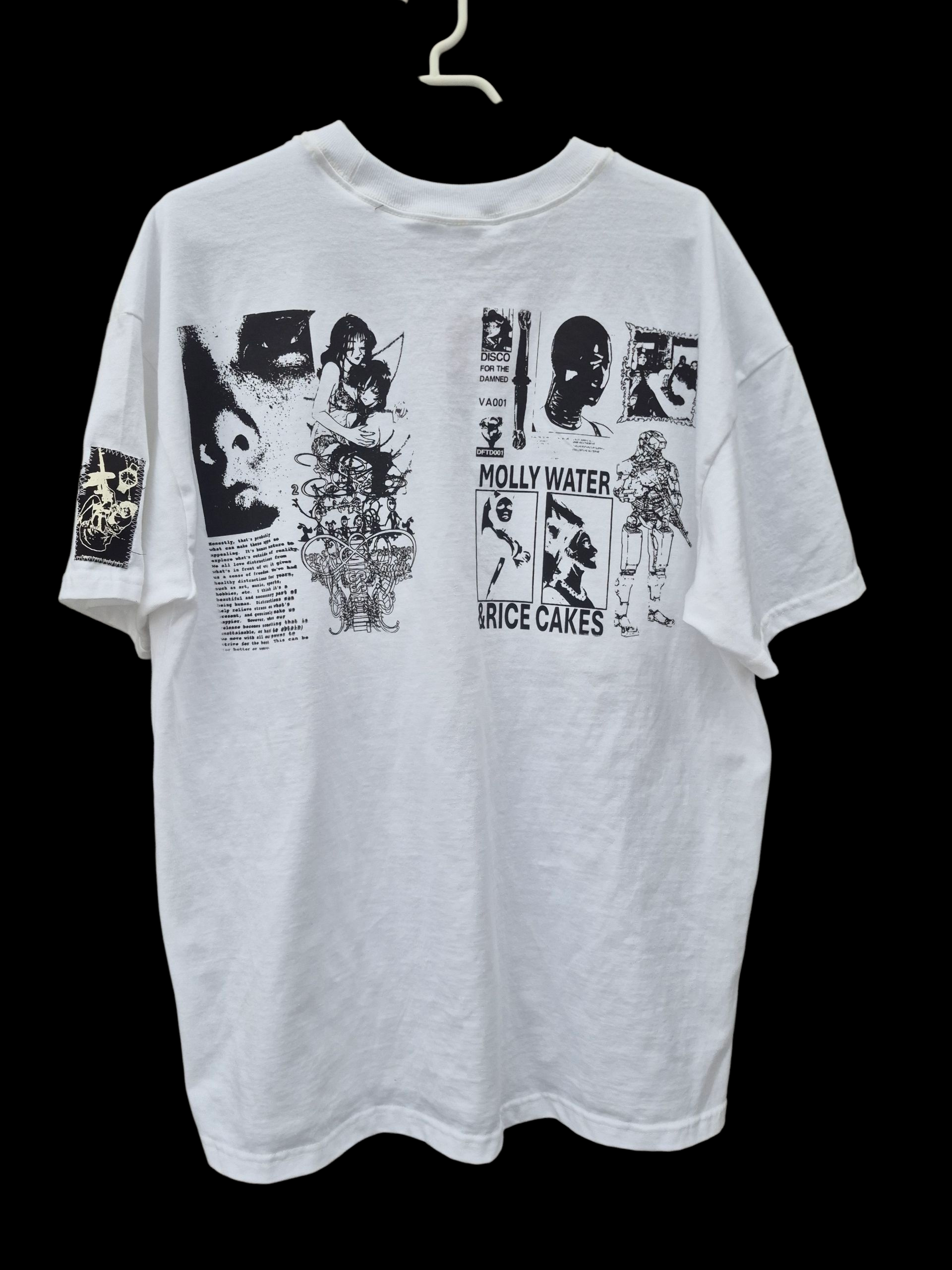 Heavyweight white cotton tee with prints & printed patches on the front, back, & sleeves.