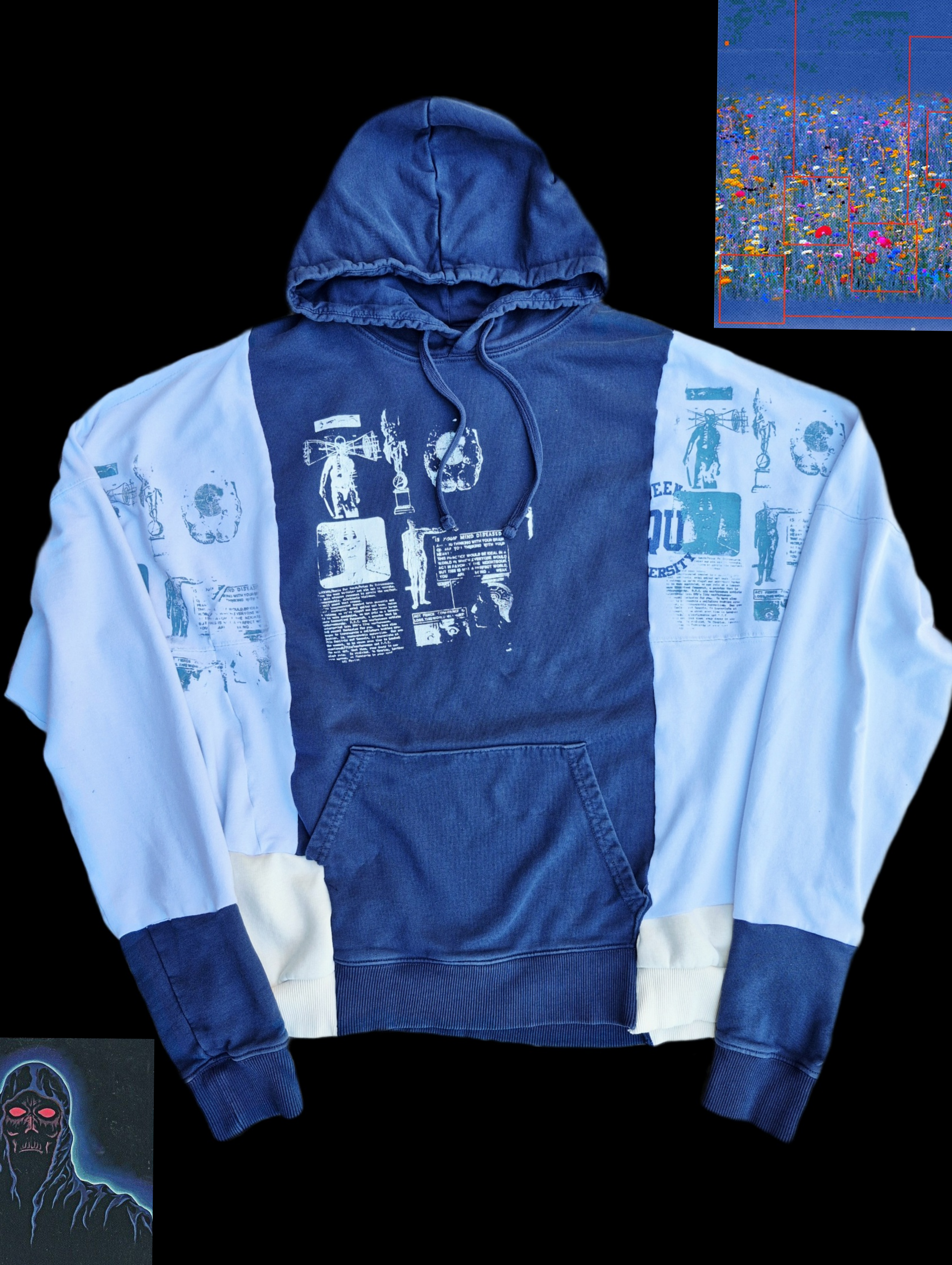 Β Β Β White & blue reworked hoodie with a baggy, oversized fit with extended sleeves & matching navy blue prints on the torso & sleeves. Chunky ribbing encircles each wrist while its fit is loose & light.