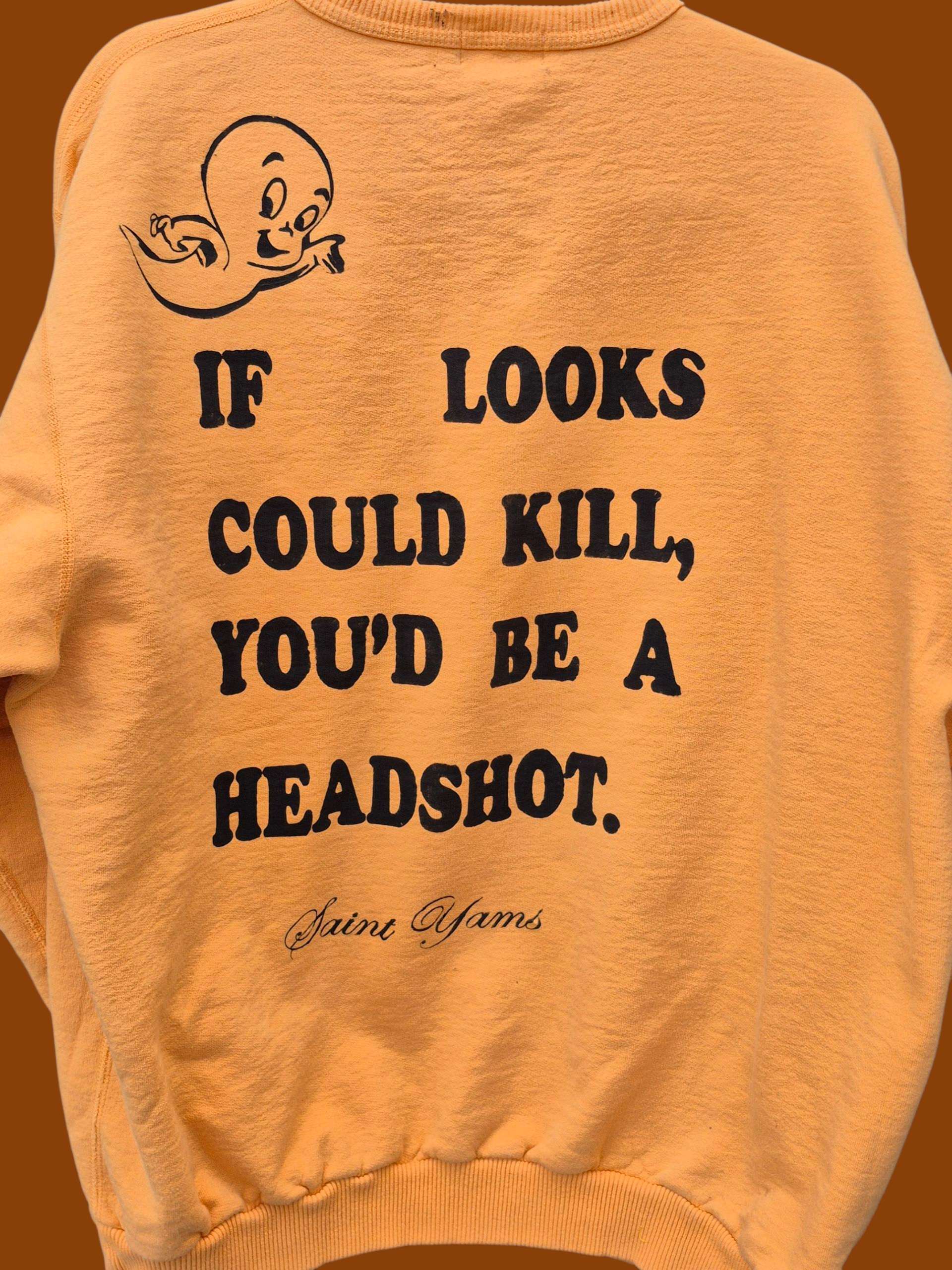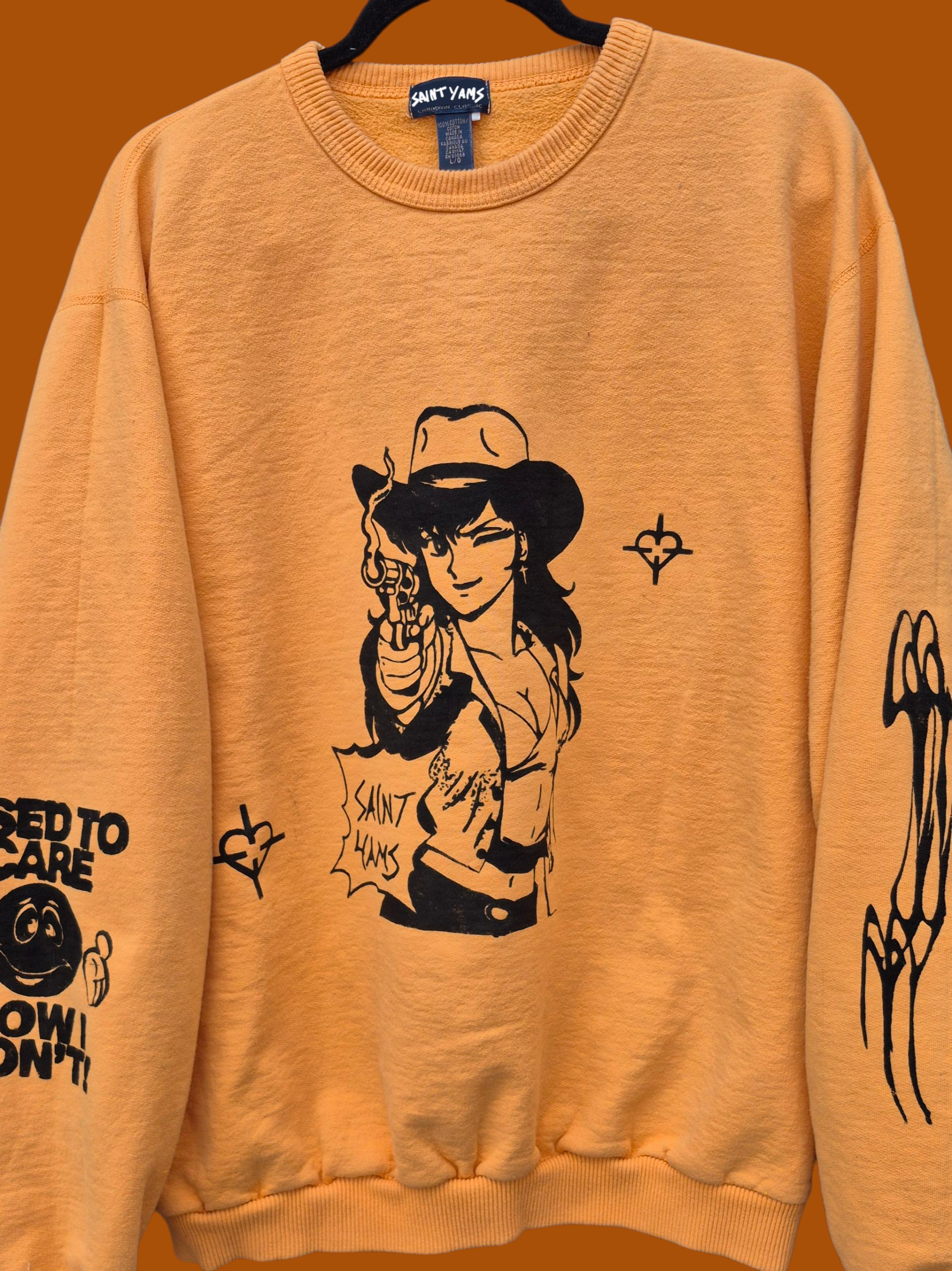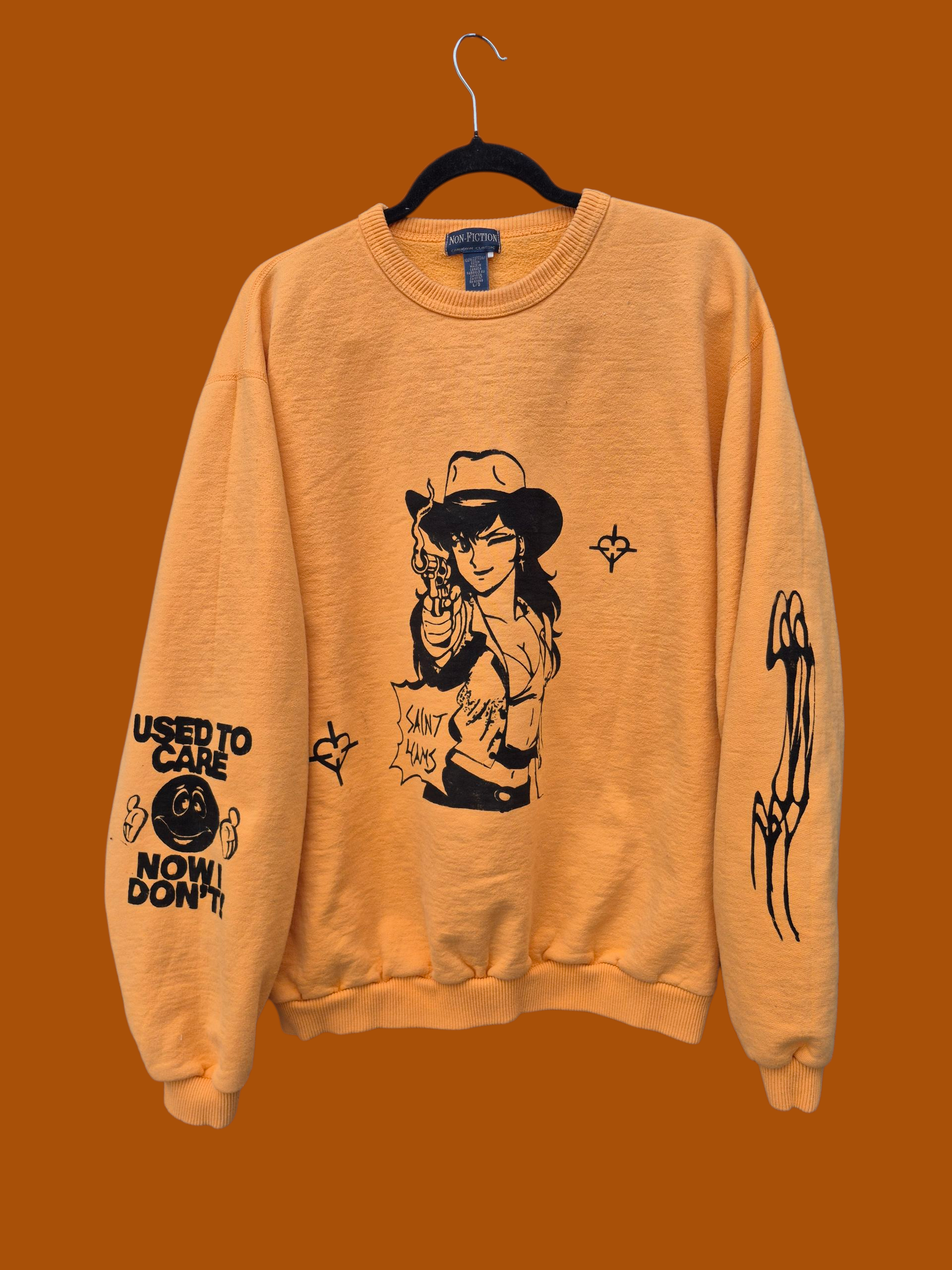 Wild western themed graphics printed on a true Canadian classic, a peach colored cotton Non-Fiction crewneck sweater. A brand so ahead of its modern day contemporaries like Gildan & Russell Athletic in terms of quality it's like comparing a gourmet meal to a bowl of lead paint. Unfortunately, Non-Fiction brand sweaters are no longer in production making the ones in peak condition, much like this one here, even more valuable as the available stock approaches zero. So put the lead paint away and treat yourself to the good stuff, you'll thank me later.