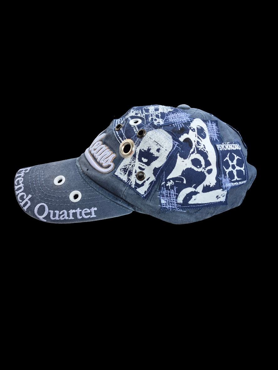 Β Β Acid washed navy blue ball cap with adjustable strap-back, embroidery, canvas patches with custom prints throughout and grommets, in a range of sizes, in the brim and front panels.