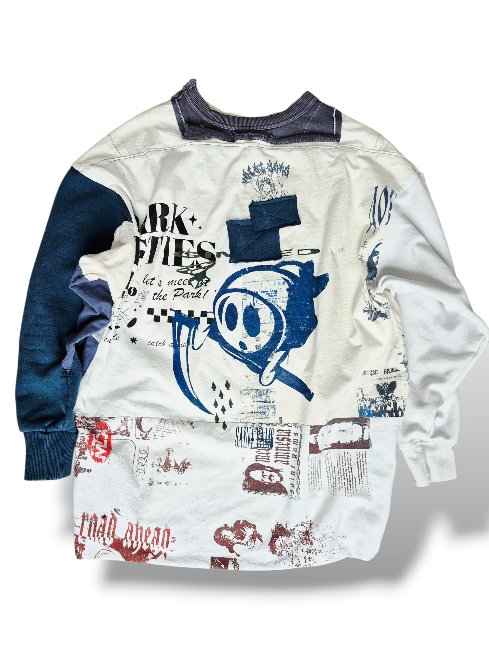 Β Β Β Long sleeve shirt with an oversized cut & made from reworked graphic tees & sweatshirts.The sleeves were entirely sourced from heavier garments, as was ~30% of the body, making this one generally heavier and warmer than what is generally expected from a traditional long sleeve shirt.Β