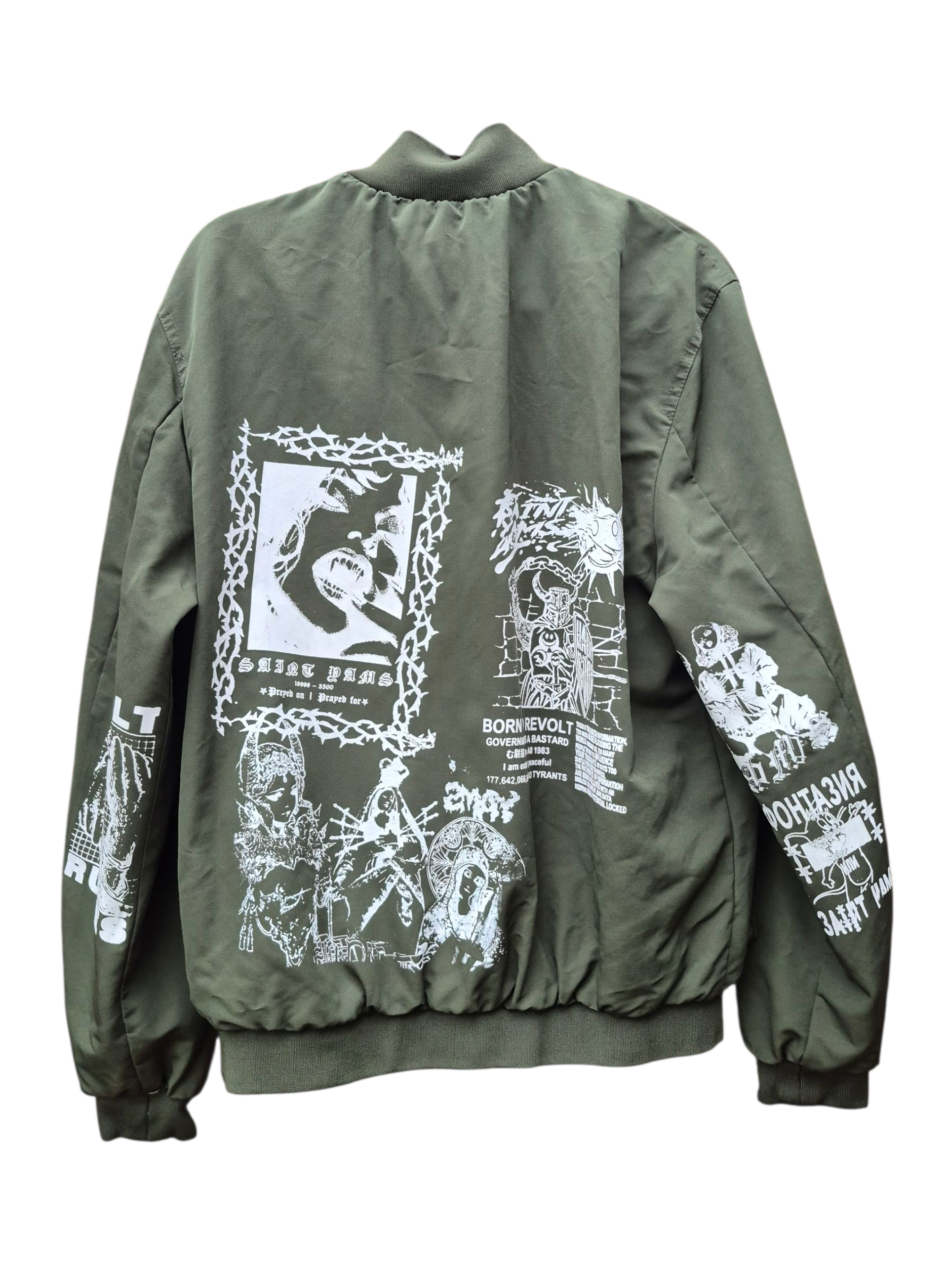 Β Β Lightweight forest green bomber jacket with a large grouping of cargo pockets lining the front & custom white prints on the front, back, & both sleeves.