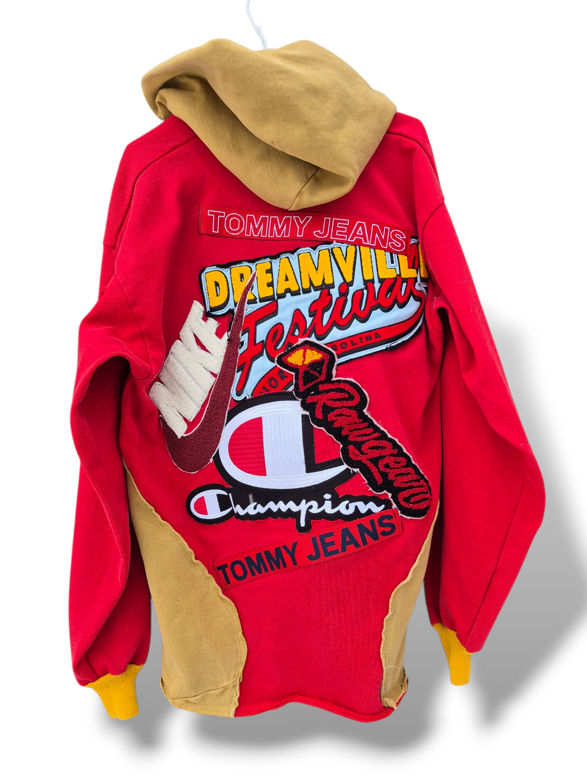 Thick & heavyweight cotton rugby jersey hoodie. A red & dark yellow hoodie in the style of a traditional rugby jersey featuring two large angled pockets secured with chrome zips, printed patches, 'YAMS' embroidery accross the chest, a vintage style chrome zip at the collar, and an array of large patches, both chenille & embroidered varieties, from various brands including Nike, Champion, Tommy Hilfiger, Rawgear and the largest of the bunch, Dreamville Festival, a multi-day concert hosted by theΒ music label of the rapper J. Cole.