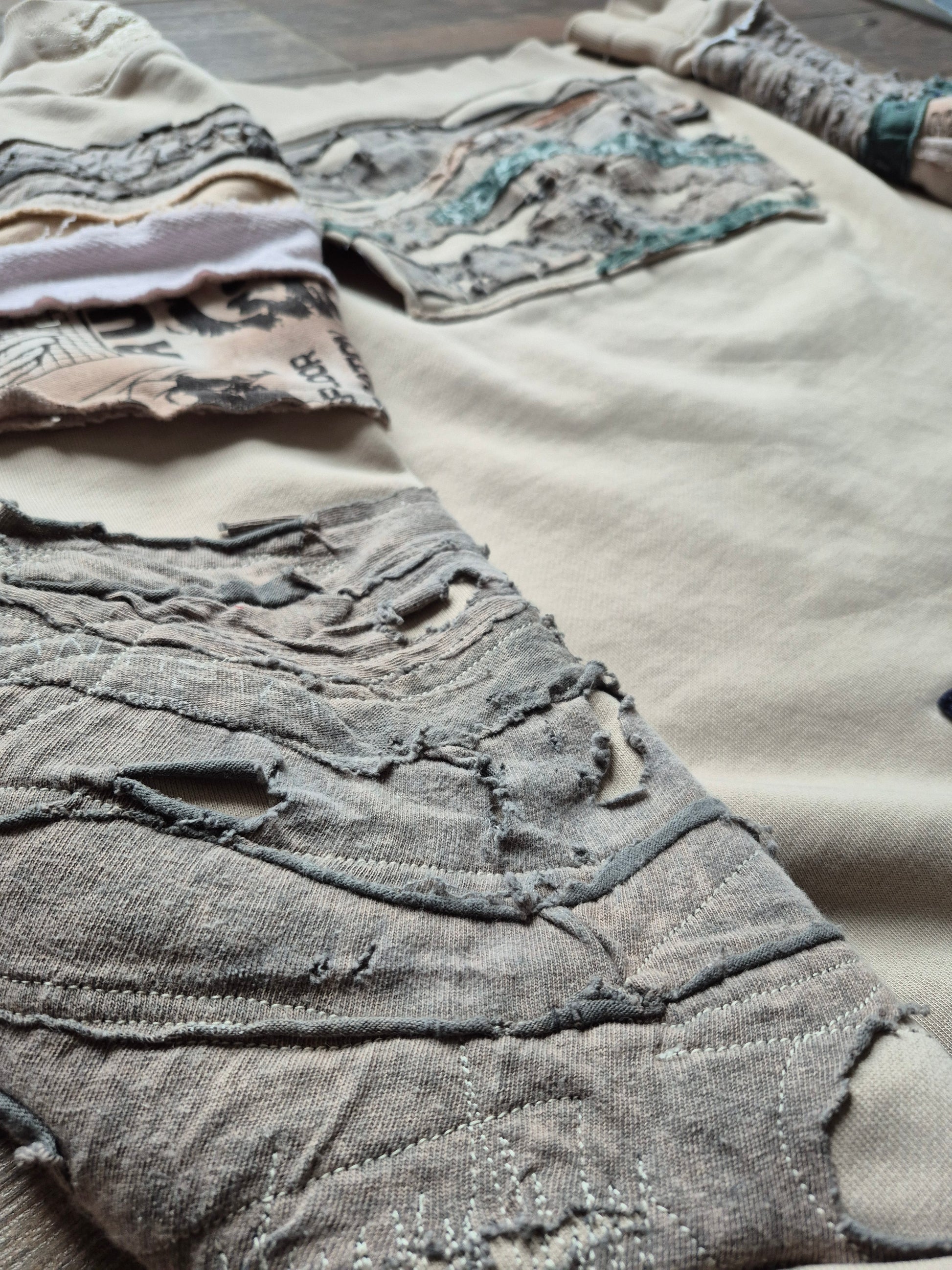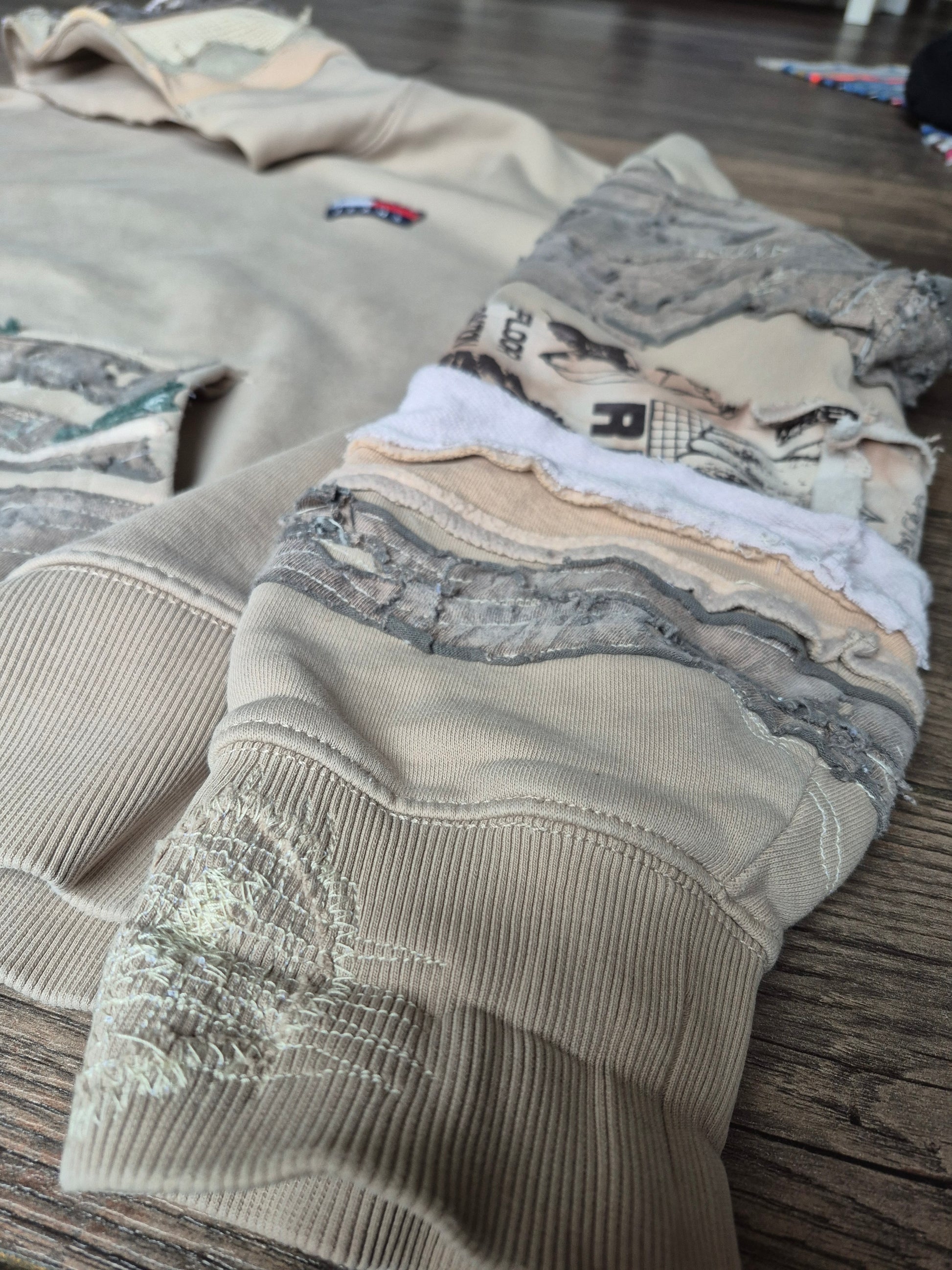 A heavyweight beige fleece cotton Tommy Hilfiger hoodie with reworked, patchwork, wrapped & distressed sleeves, pouch pocket & hood. Vintage style prints line the back.
