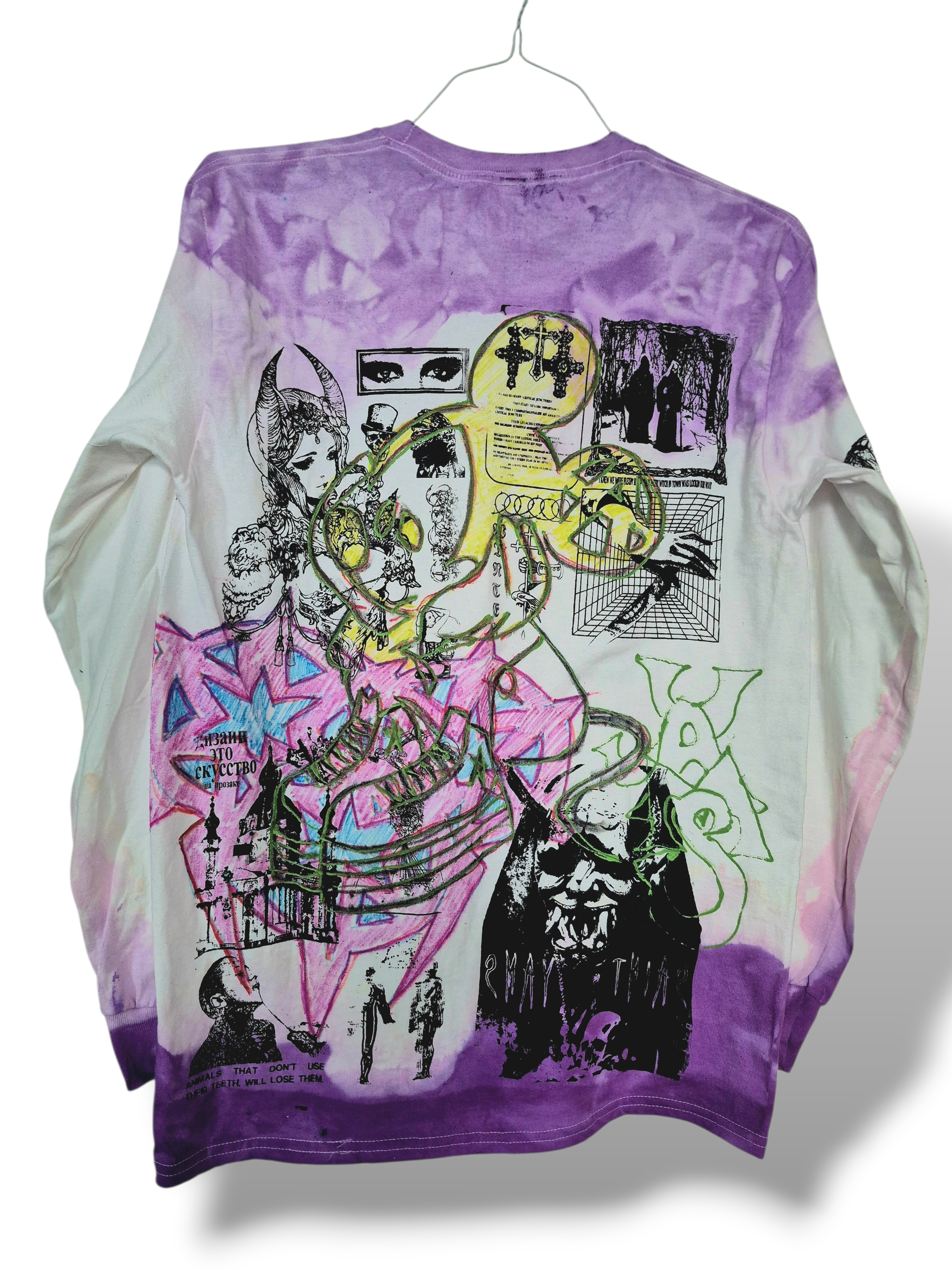 Β Β Custom one-of-a-kind long sleeve tee in a style best described 'multidisciplinary'Β given the wide ranging methods and techniques used in its creation. Dip-dyed, screenprinted, hand drawn and canvas printed patches are just some of the super powers utilized in the creation of this rare breed of tee.Β