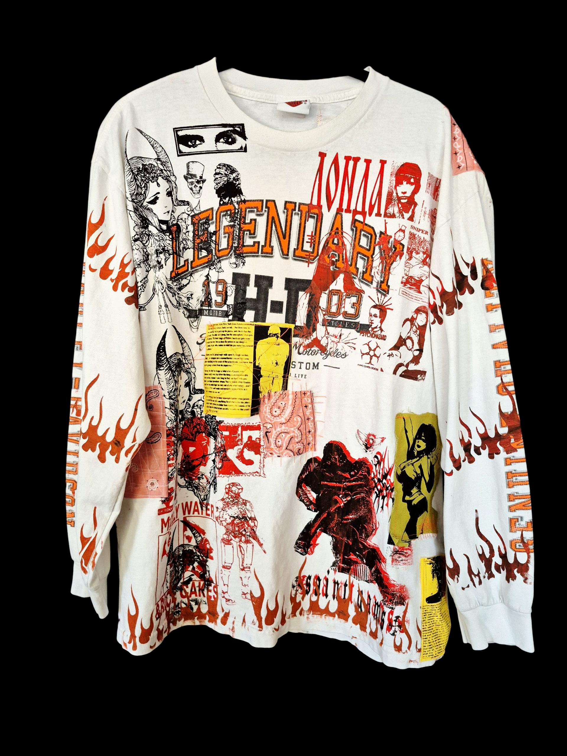 Β Β A white Harley Davidson long sleeve tee with an explosion of orange & black prints on the front, back & both sleeves with printed canvas & paisley patches mixed in. This is a reworked vintage garment, fabric is in ideal condition, no scuffs, scrapes or scratches, just a whole bunch of printed graphics.
