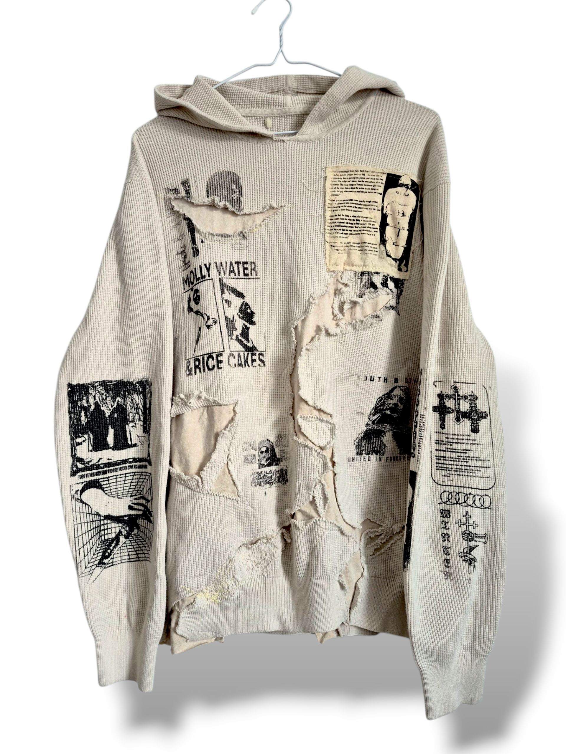 Β Β Cream colored knit cotton hoodie with prints covering the front, back & each sleeve with large, distressed, & visibly mended rips in the outer layer of fabric giving way to a 2nd layer of matching, acid washed ring spun cotton. Cozy warm, distressed & aesthetically unique ...as always.