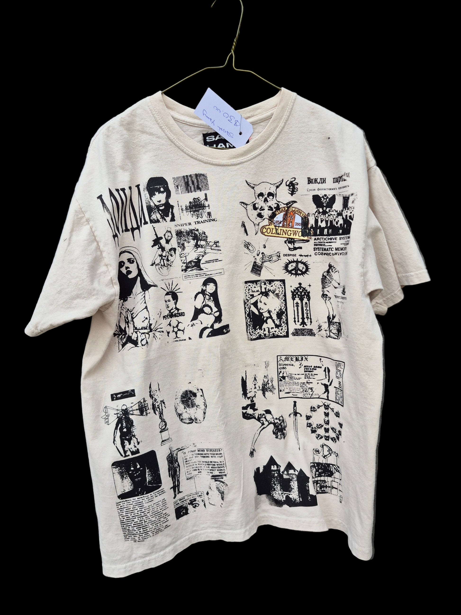 But you know what doesnt lie to you? This heavyweight beige cotton tee that's covered front to back with custom prints, a neckline that says "I'd never lie to you," and two sleeves exactly where you expect them to be.