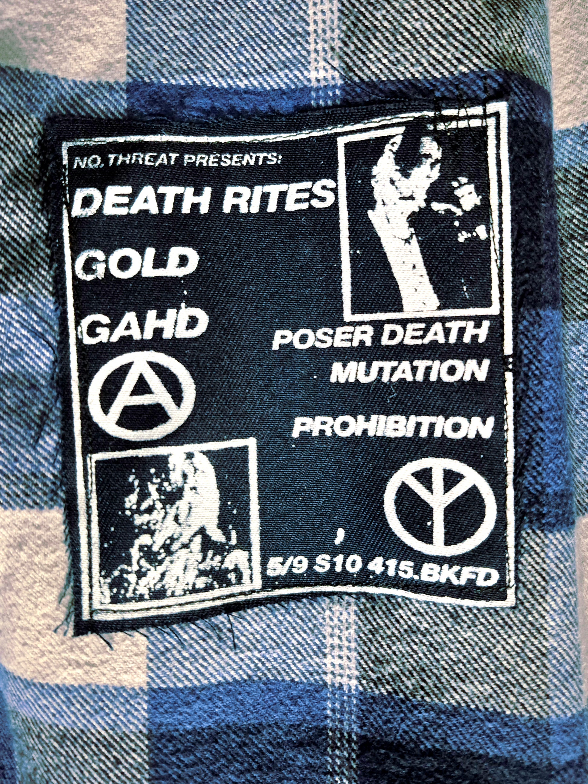 Β Β Β A thick blue & white cotton flannel shirt with navy canvas patches & white prints scattered throughout.Β