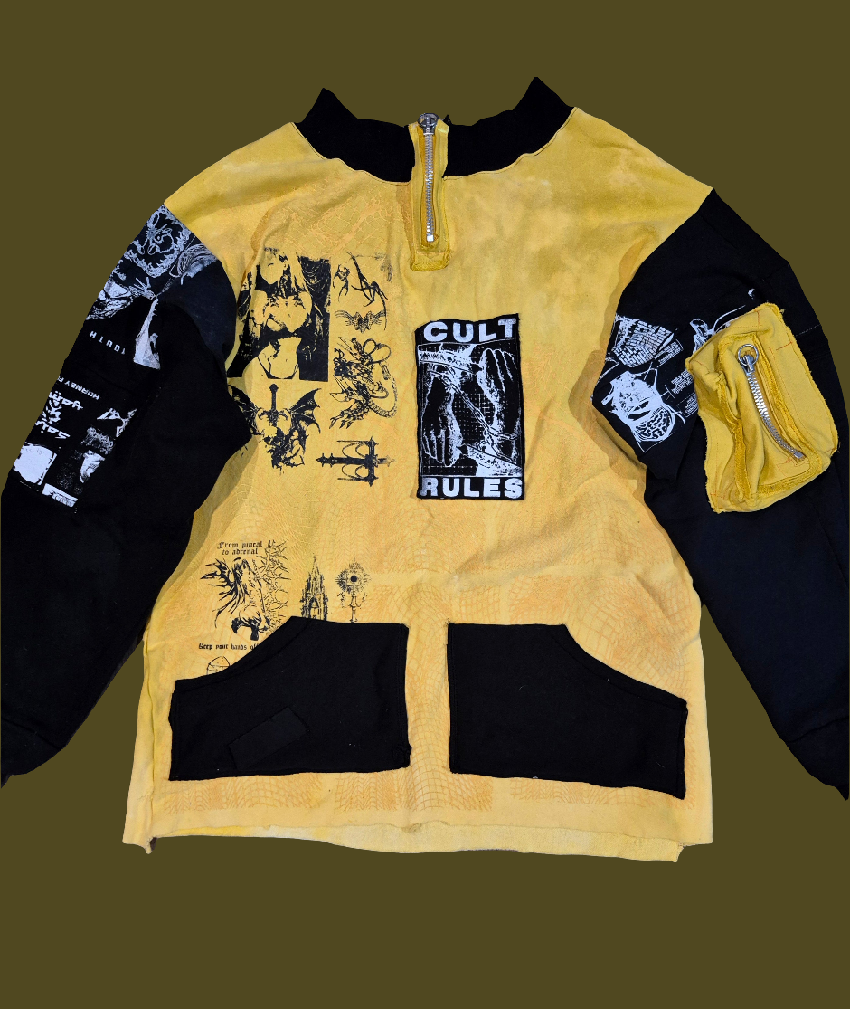 Β Β Yellow French terry quarter-zip sweater with voluminous black sleeves, custom prints throughout,Β an inverted style pouch pocket and a 3D zippered cargo pocket on the sleeve. Made from 100% cotton, while the zippers are trendy vintage military zips with circular pull-tabs.Β