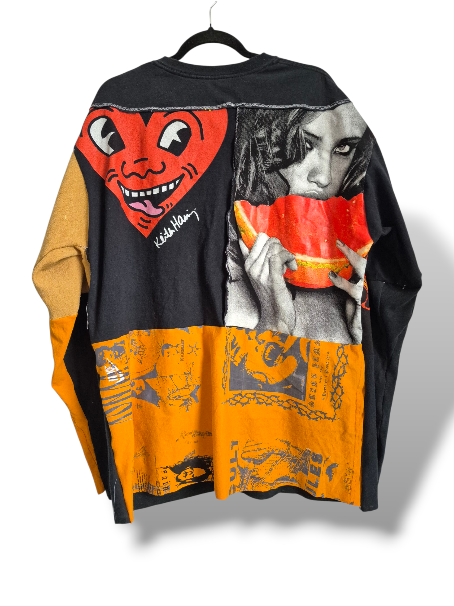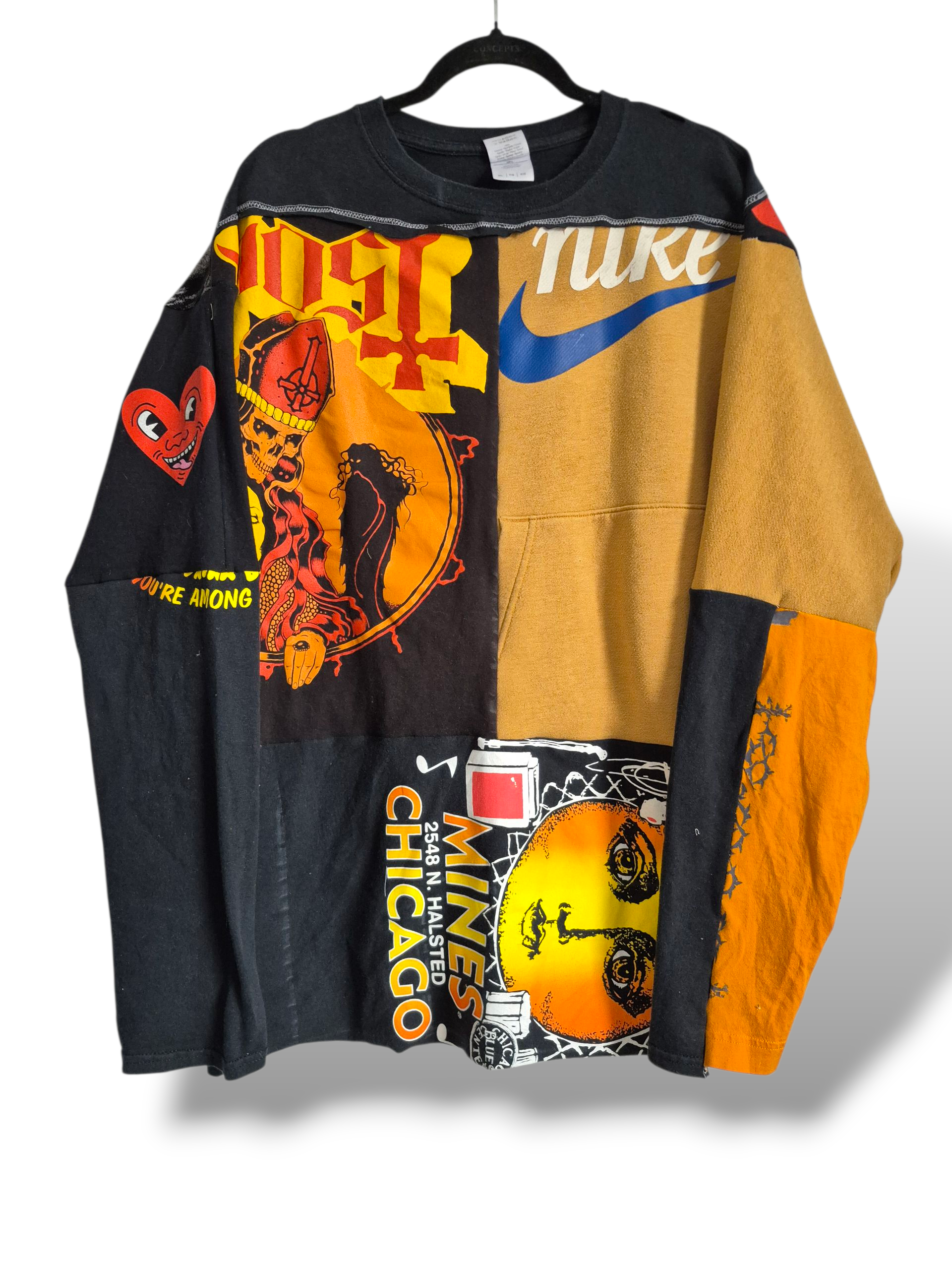 Long sleeve patchwork tee made using reworked & repurposed garments.